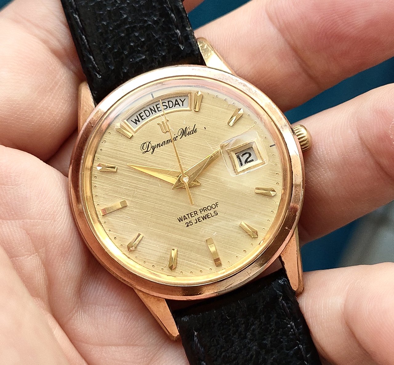 Dynamic Wide Automatic 25 Jewels, phom Rolex. Zin nguyên củ, mặt phên vàng zin đẹp, kính lúp zin có logo luôn, máy long lanh với chức năng lịch giựt như Omega. Size men 35,5 không đo núm