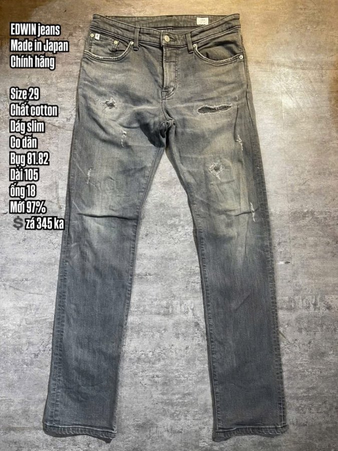 EDWIN jeans / Made in JapanChính hãng / Size 29Chất cottonDág slimCo dãnBụg 81.82Dài 105ống 18Mới 97% 💲zá 345 ka