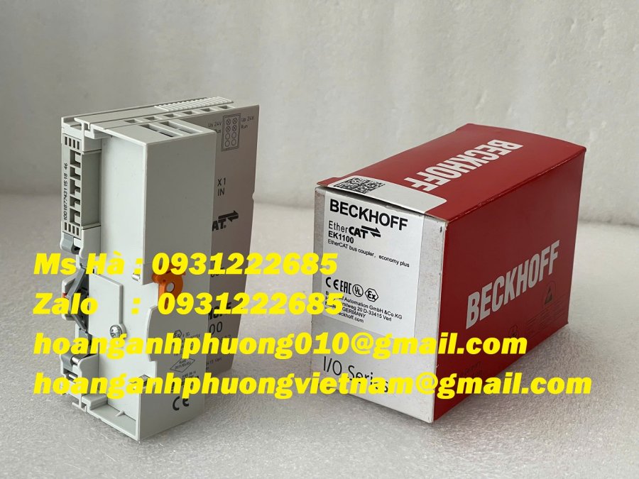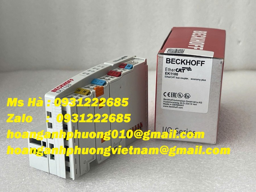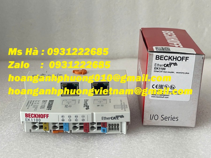 EK1100 là một bộ ghép nối dùng để kết nối mạng EtherCAT (qua cổng RJ45 Ethernet) với hệ thống các terminal đầu vào/ra (I/O Terminal) của Beckhoff