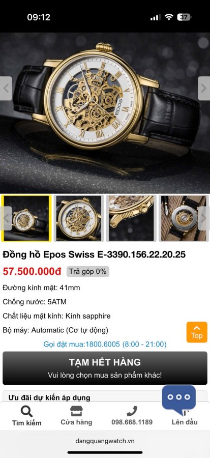 Epos Swiss E-3390.156.22.20.25Thiết kế Sleketon cực đỉnhToàn thân mạ vàng ươmSize 42Máy Eta2892 cực khủng