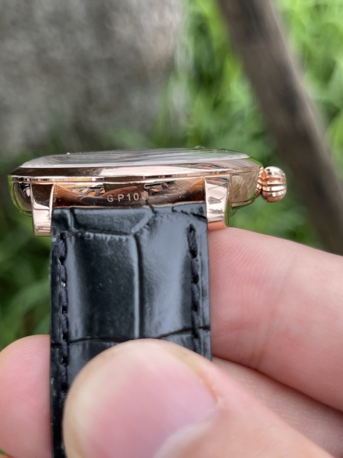 Vỏ vàng hồng GP10, mặt khảm trai vân Colimaçon, kính sapphire cong chống lóa 💎