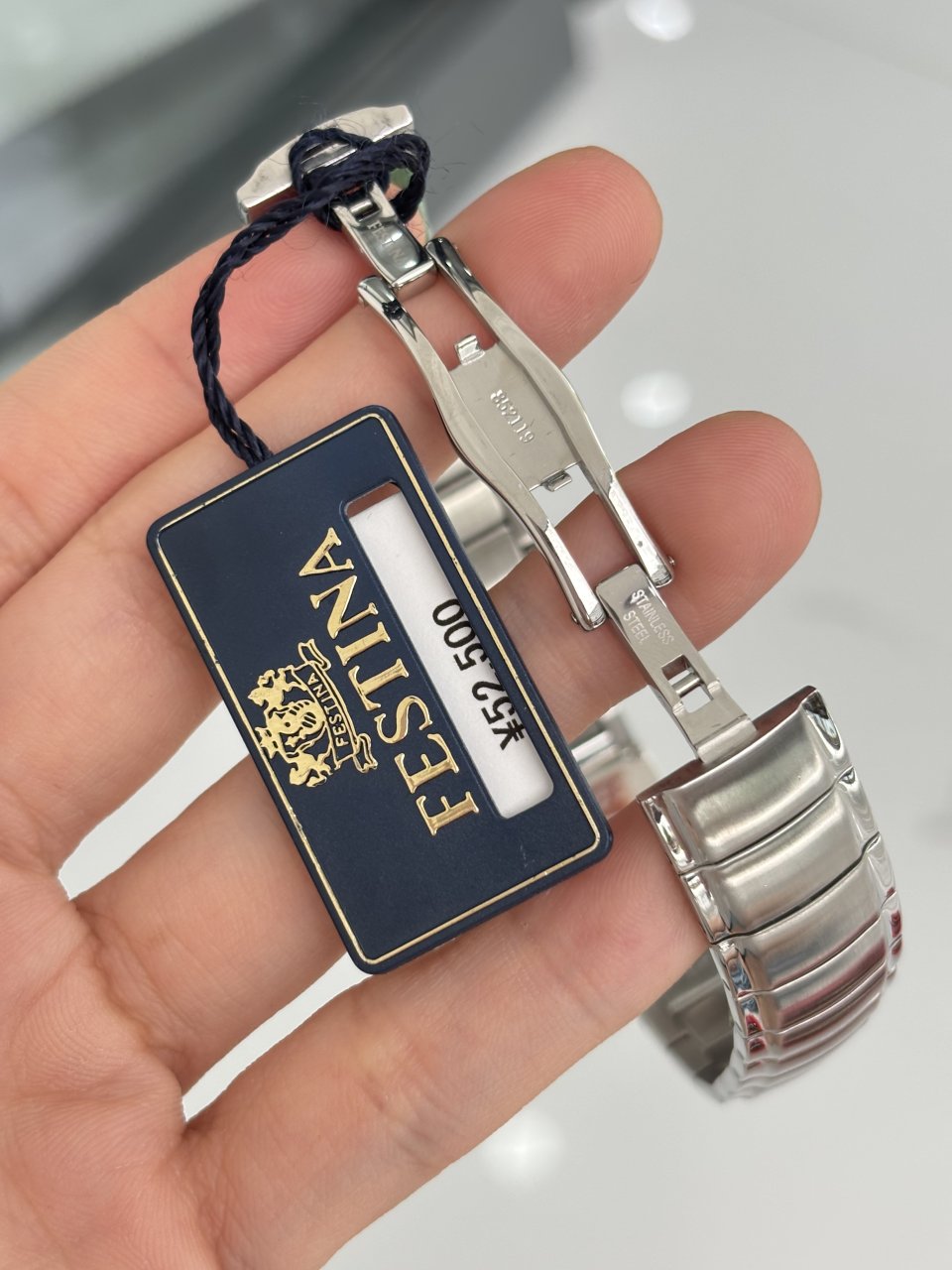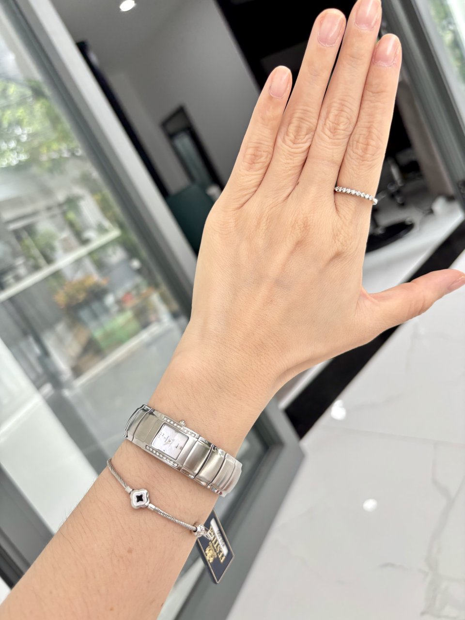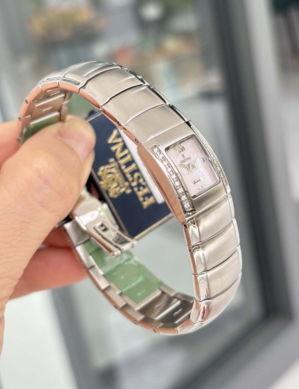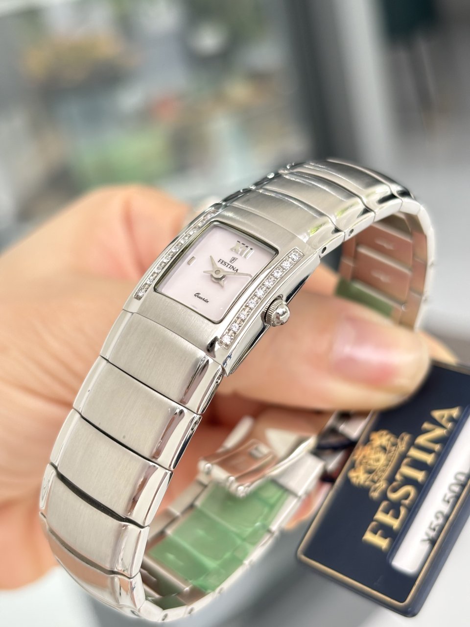 - Hàng trưng bày chưa qua sử dụng tem hãng gần 10 triệu- Size mặt và dây 17mm niềng đính đá quý.- Mặt xà cừ lấp lánh. Thiết kế đơn giản nhưng ko kém phần sang trọng