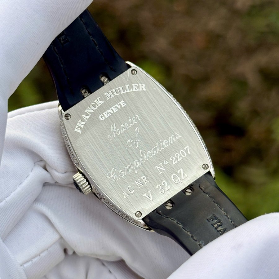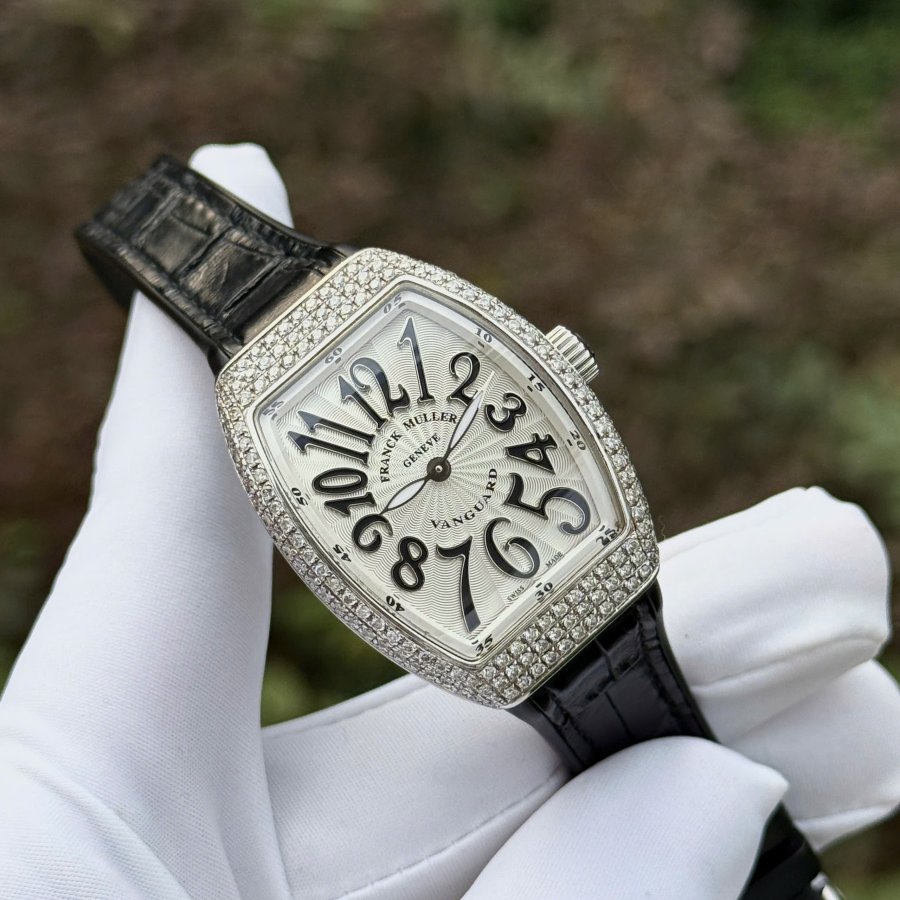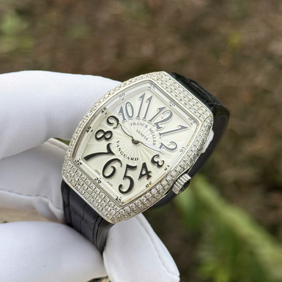 Franck Muller Vanguard Automatic V32 QZ không chỉ là một chiếc đồng hồ, mà là một tác phẩm nghệ thuật lộng lẫy, được bao phủ bởi những viên kim cương thiên nhiên tinh khiết. Món trang sức đẳng cấp này khẳng định phong cách vương giả và sự tinh tế không thể nhầm lẫn của người sở hữu.