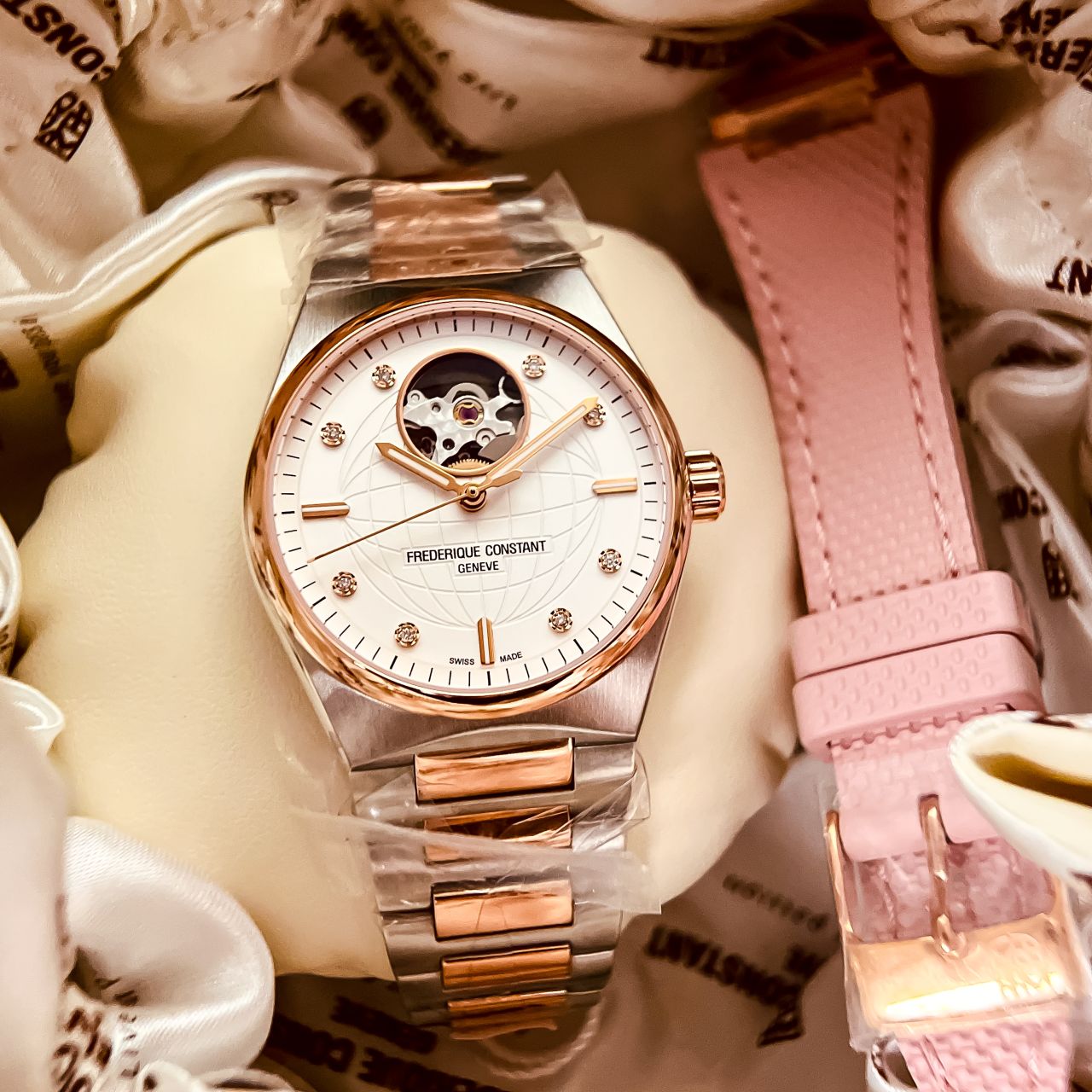 ✨ Thiết kế đẳng cấp Thụy Sỹ – Mặt số 34mm lộ cơ Heart Beat tại vị trí 12h, điểm xuyết 8 viên kim cương thiên nhiên, biểu tượng địa cầu khắc nổi tinh xảo.