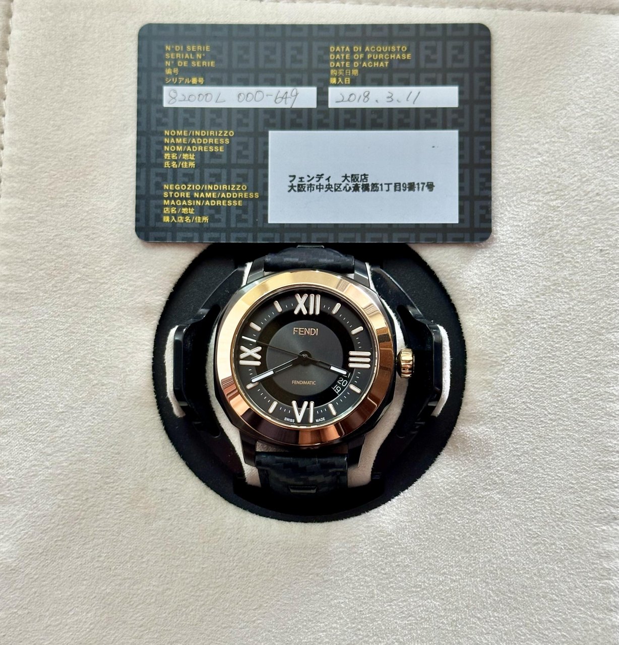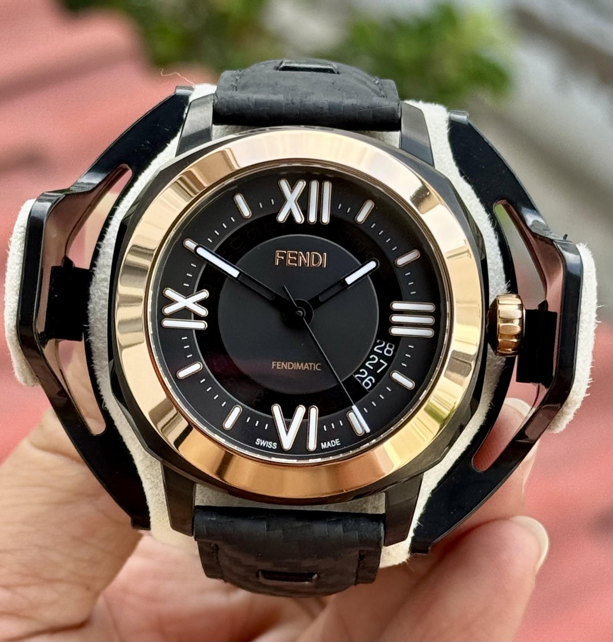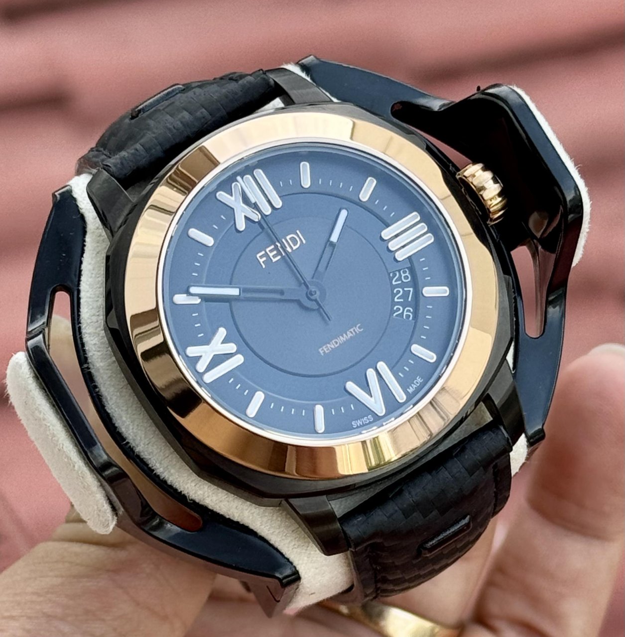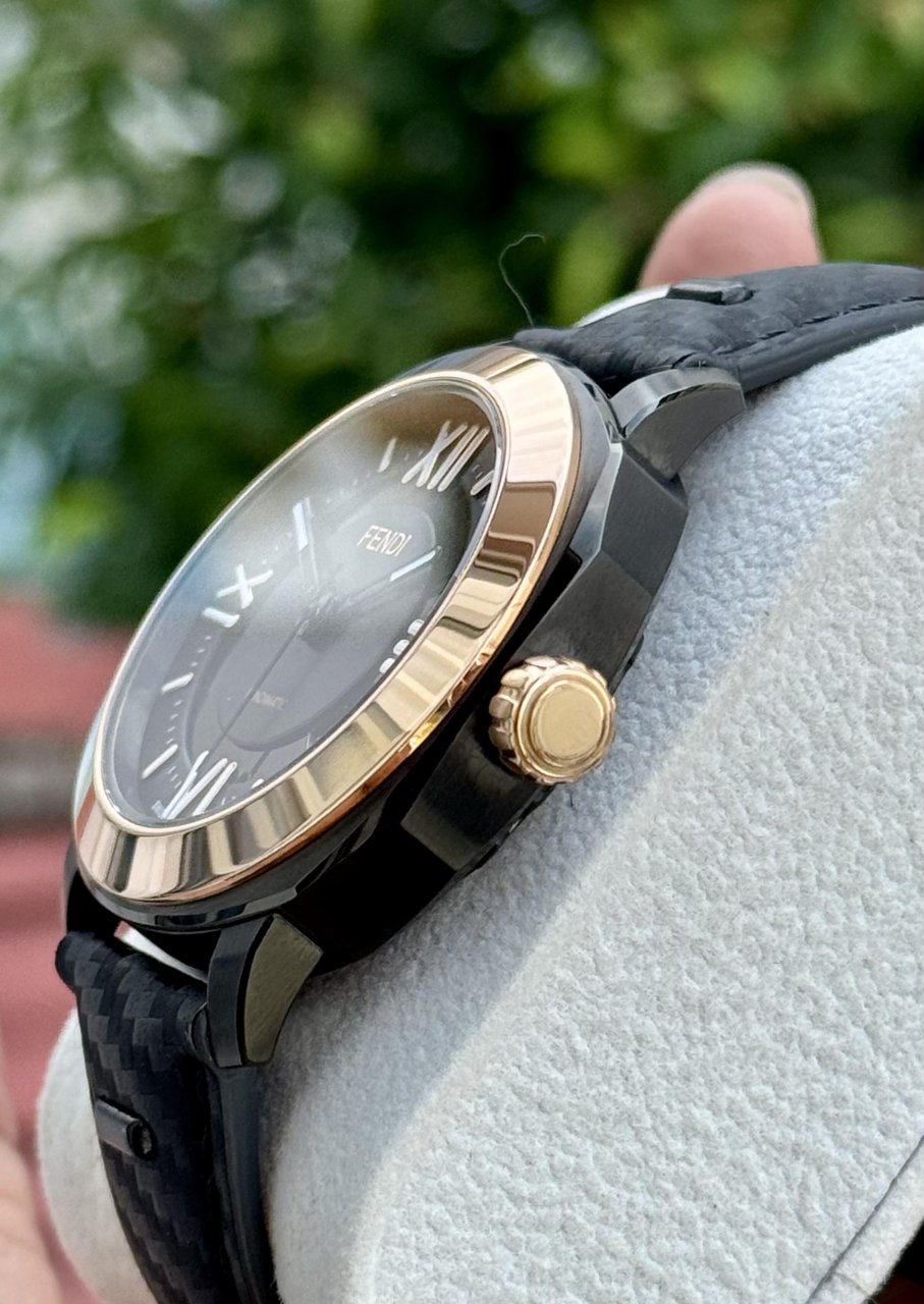 Fendimatic Automatic 42mm là hiện thân của sự sang trọng hiện đại: thiết kế mạnh mẽ, viền vàng hồng quý phái, mặt số tối giản tinh tế, bộ máy automatic Swiss Made với mặt đáy lộ cơ đậm chất sưu tầm.