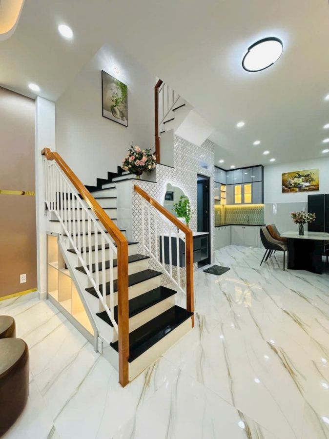 - Vị trí : Nguyễn Văn Khối - P.11 - Gò Vấp , HCM. - Hướng : Tây Nam. - Kết cấu : 1 trệt 1 lầu đúc BTCT; gồm sân rộng rãi để xe, phòng khách, phòng bếp, 2PN, 3 toilet riêng biệt từng phòng, có ban công cửa sổ giếng trời rất thoáng. - Đường : 4 m khu dân cư an ninh yên tĩnh. - Diện tích : Ngang 4.1 dài 13. Có thêm gần 10m làm sân và giếng trời. - Pháp lý : Sổ hồng riêng hoàn công đầy đủ. - Nội thất bàn giao : Full option.