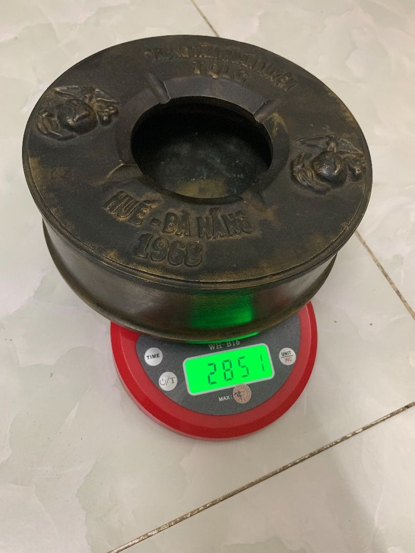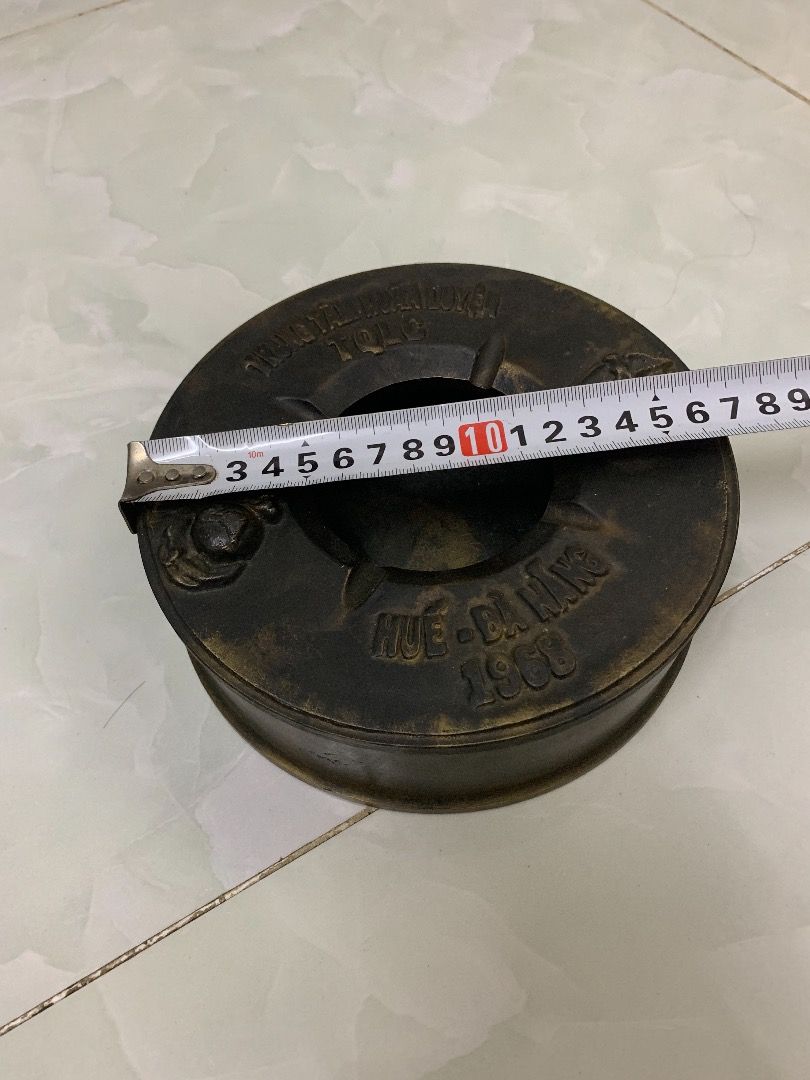 gạt tàng đồng Huế - Đà Nẵng 1968 như trong hình. Chất liệu được đúc bằng đồng, kích thước cao 6cm đường kính 17cm nặng 2,85kg. Giá chuẩn 2,5tr các bác quan tâm vui lòng liên hệ cho em nhe!
