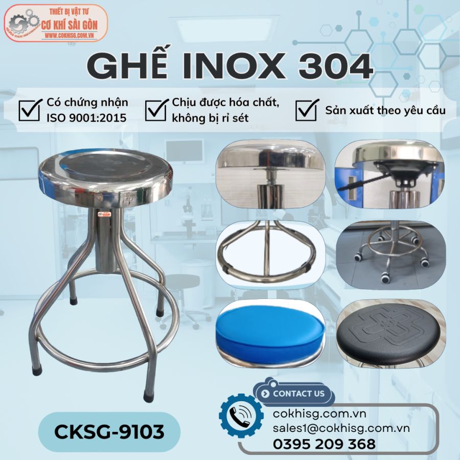 Ghế Inox 304 dùng trong phòng thí nghiệm, công ty thực phẩm do Cơ khí Sài Gòn sản xuất là loại inox không gỉ có khả năng chống ăn mòn tuyệt vời. Điều này giúp ghế thí nghiệm inox 304 có thể chịu được môi trường khắc nghiệt của phòng thí nghiệm, nơi thường xuyên tiếp xúc với các hóa chất và dung môi