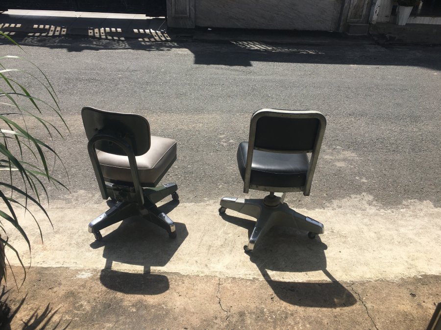 bán 2 ghế Mỹ xưa sử dụng tốt, bánh zin đẹp. Cái nệm mài đen giá 1,6 triệu đồng. Cái nệm màu trắng xám giá 2,4 triệu đồng