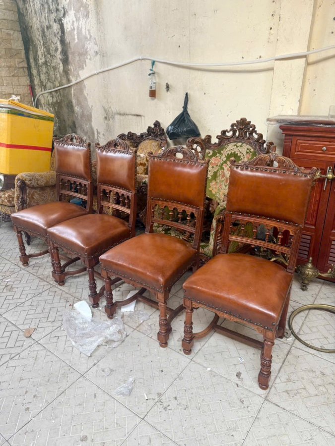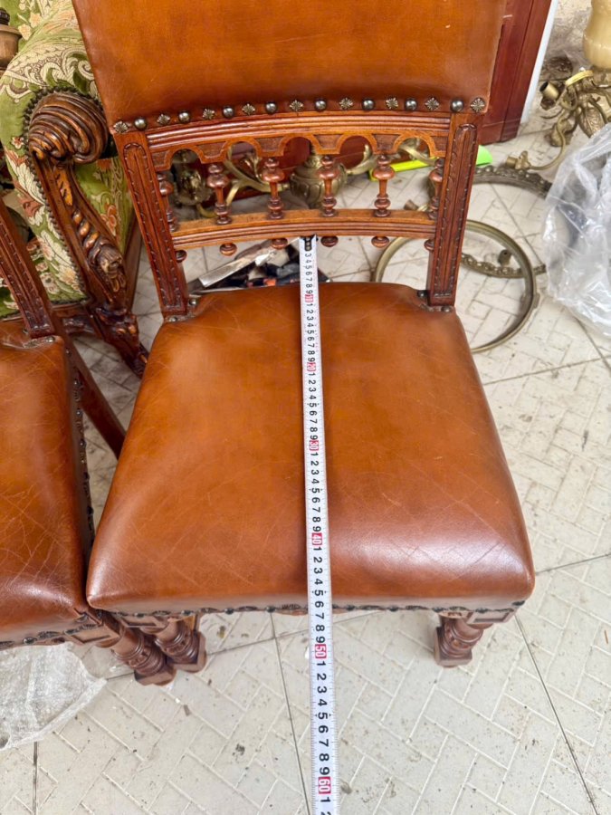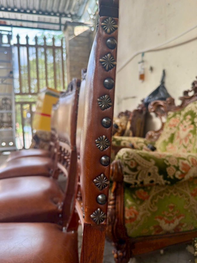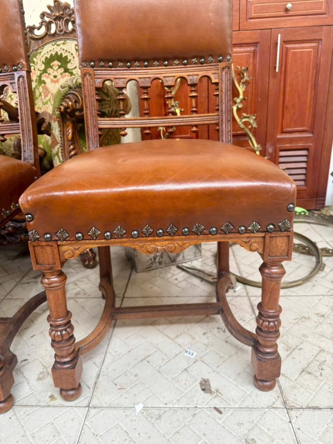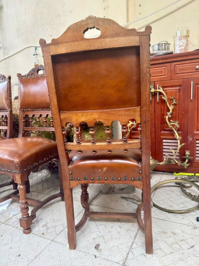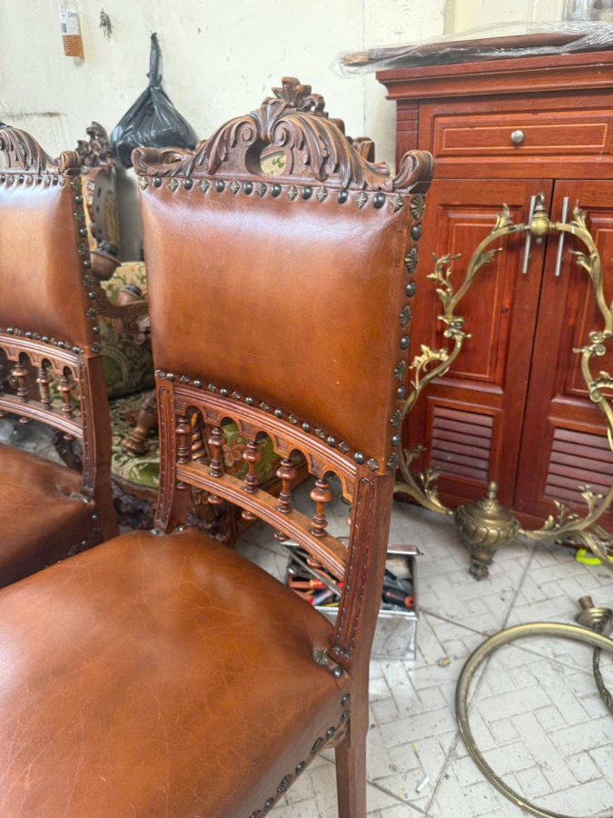 4 em ghế hàng Pháp đục chạm hết nất,hoa văn khắp người phối với da bò,các đinh tán đều đc làm bằng tay hoàn toàn,cực mới như chưa sử dụng Giá:4tr2/1 ghế Call:0333534345