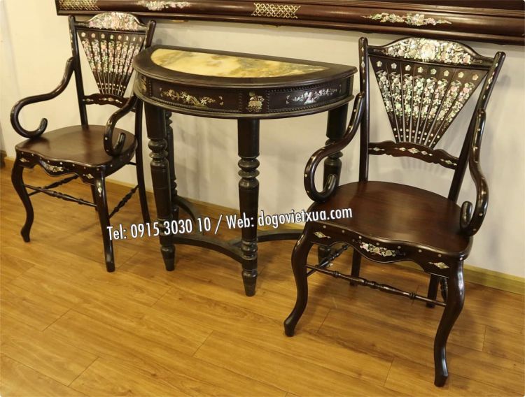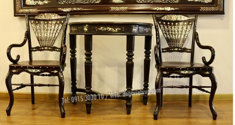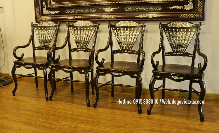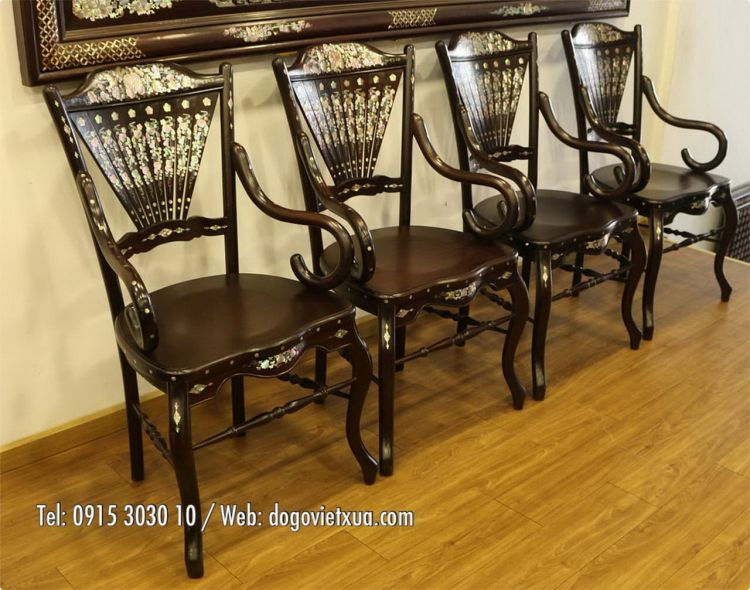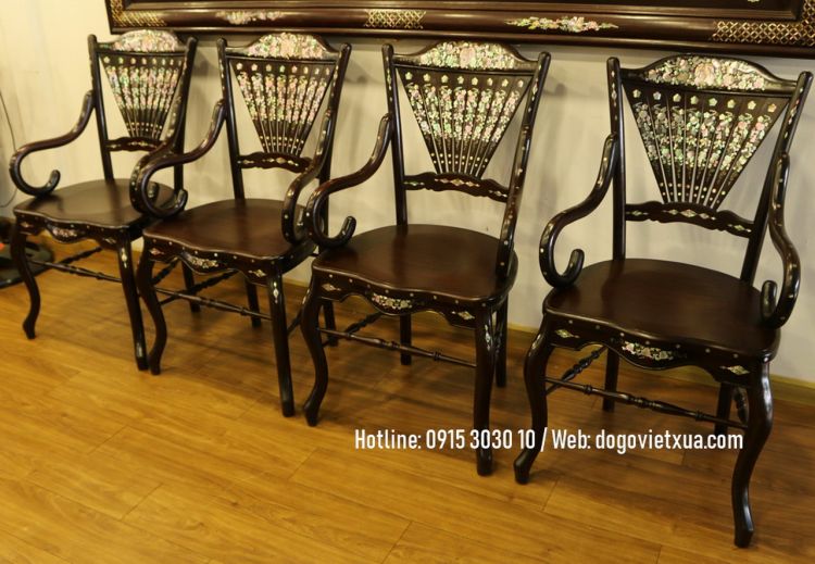 Ghế rẻ quạt: Dáng rất đẹp, nhẹ nhàng, mặt ghế là 1 tấm gỗ dày không nứt lẻ cong vênh. Cẩn xà cừ Nho Sóc, kỹ thuật khó Sen Lọng sử dụng nhiều rất công phu, tỉ mỉ kỳ công, chất ốc ở tầm cao quý hiếm .