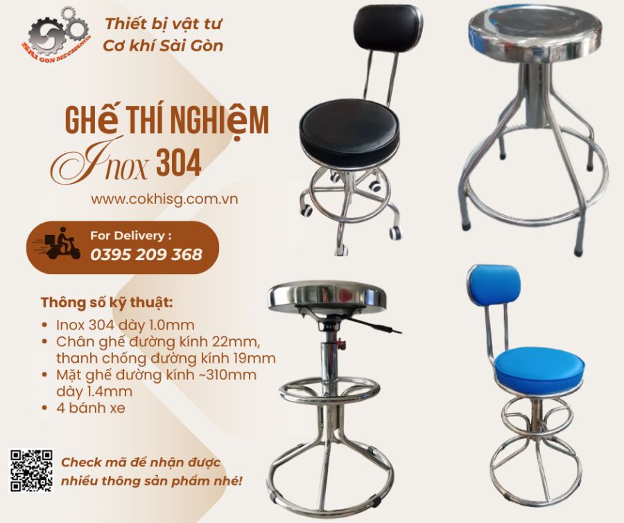 - Ghế inox 304 bền, đẹp, chắc chắn chuyên dùng cho các phòng thí nghiệm với cường độ sử dụng liên tục, chống chịu các loại dung môi, hóa chất thông thường. Dễ dàng vệ sinh.