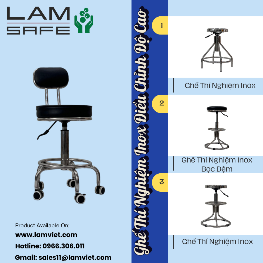 - Ghế thí nghiệm inox của Lâm Việt được thiết kế với chân đế vững chắc và bề mặt chống trượt, đảm bảo an toàn tuyệt đối trong quá trình sử dụng. Đồng thời, ghế còn có tính năng xoay 360 độ, tạo điều kiện thuận lợi cho người dùng di chuyển và thao tác dễ dàng trong không gian làm việc.