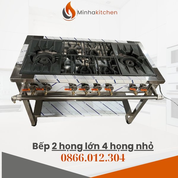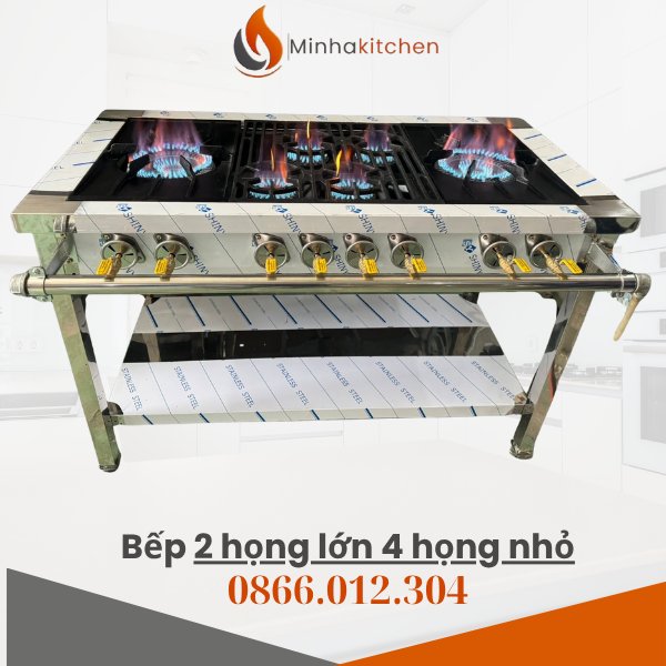Bếp công nghiệp 2 họng lớn 4 họng nhỏ là thiết bị nấu nướng chuyên dụng cho nhà hàng, quán ăn Hàn Quốc, quán mì cay, quán cơm rang, quán ăn bình dân hoặc bếp ăn công nghiệp.