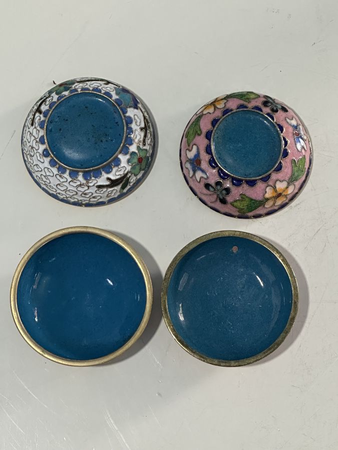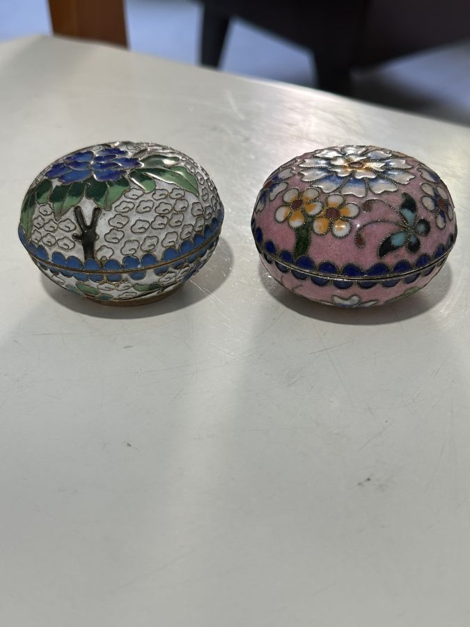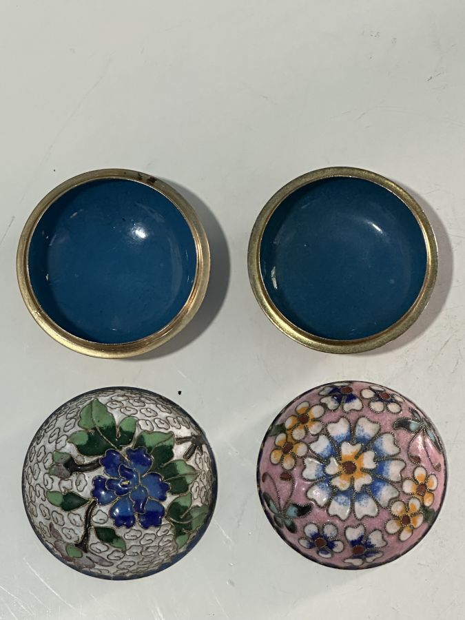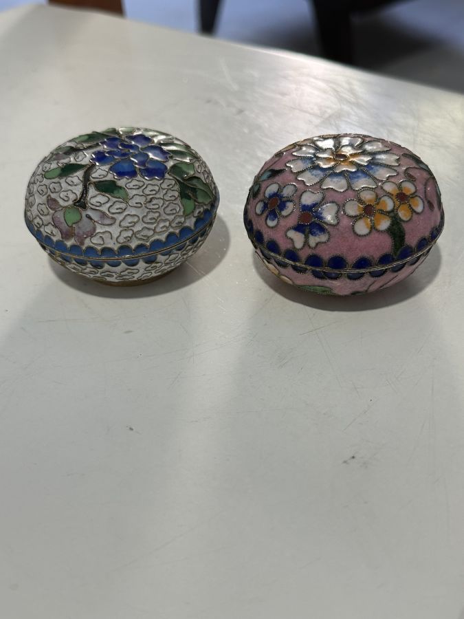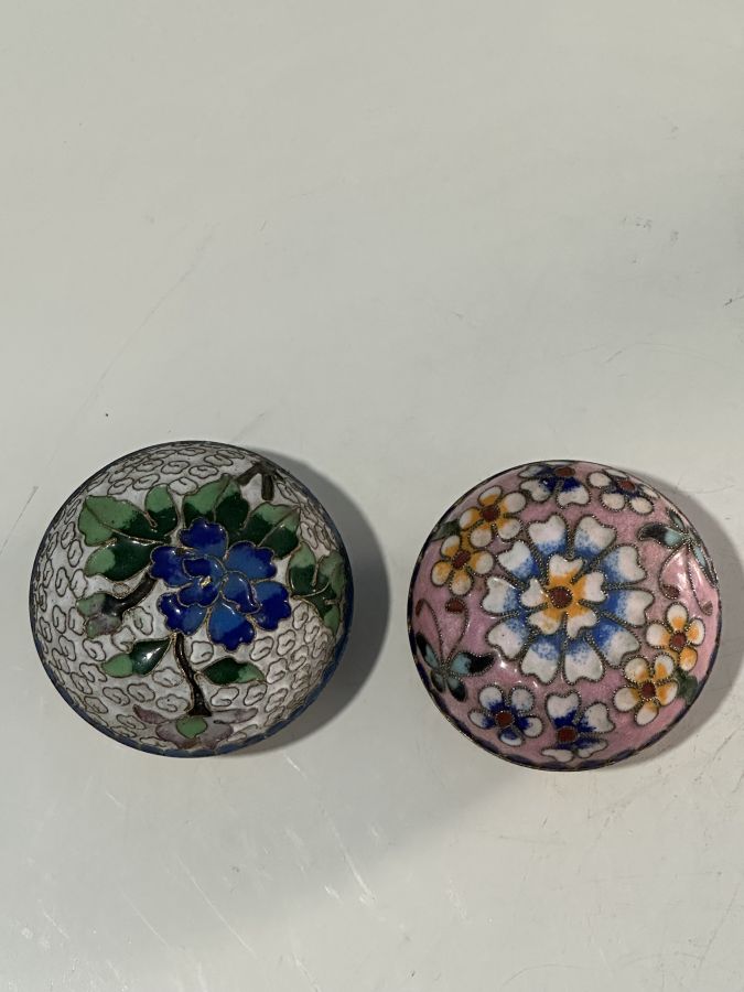 Hộp phấn Pháp lam đồ Huế xưa chuẩn cổ vật.Cái Hồng ngang 6,5cm, cái còn lại 6,7cm. Dày nặng đẹp. Giao lưu 650 ngàn ( 2 hộp).. BAO GỞI