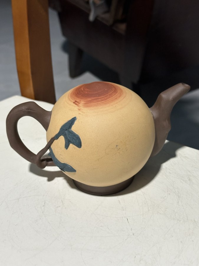 Ấm chu sa đấp nổi..dáng trái đào.. trôn đất gan gà. Loại to rót dưới trôn..Từ vòi tới quay 17,5cm.. hàng chuẩn cổ vật hiếm gặp... Bán 750 ngàn đồng bao gởi