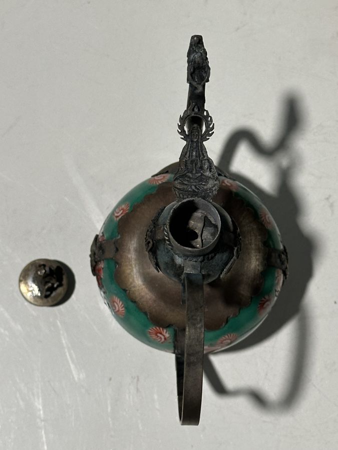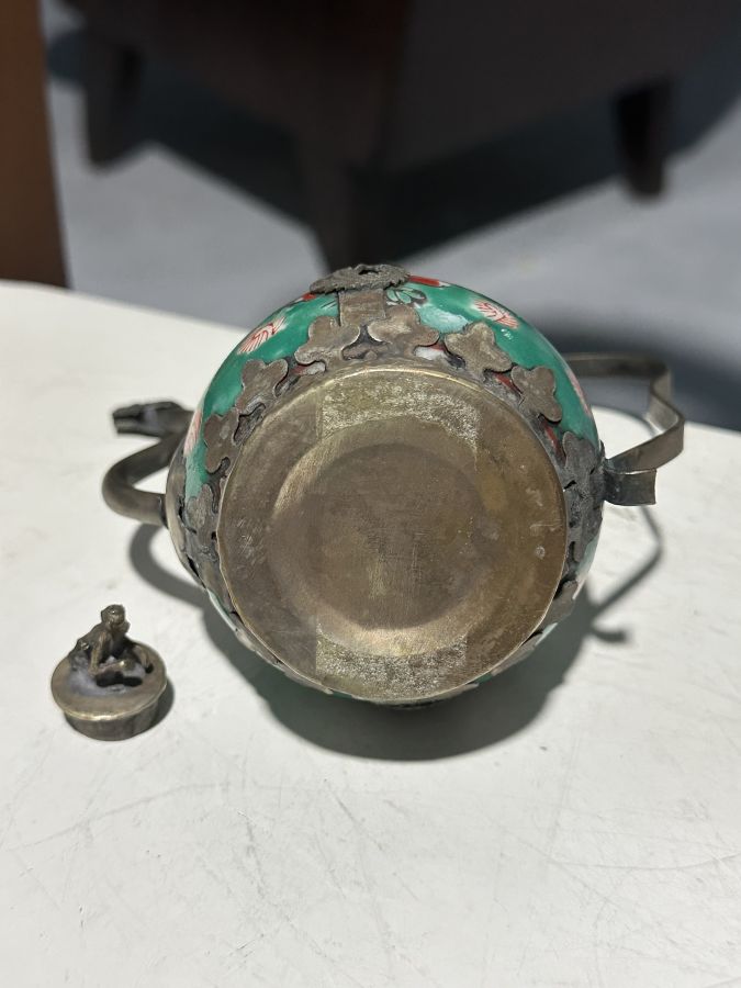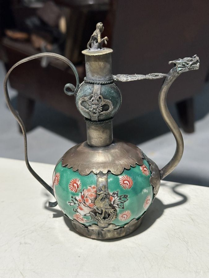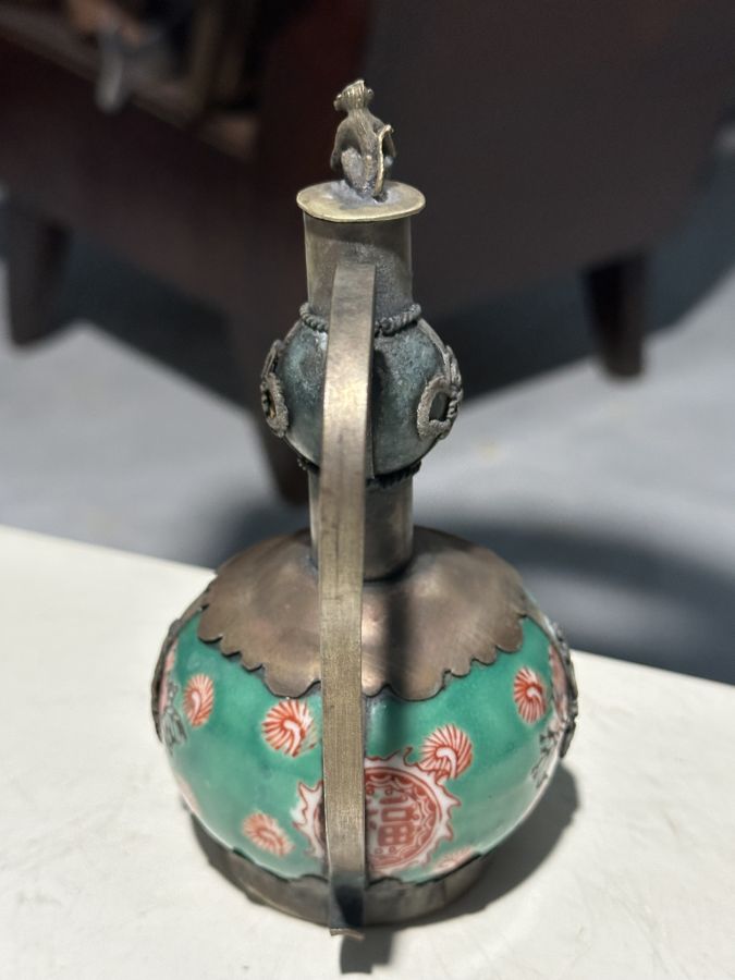 Ấm R.ượu. Đồ Huế xưa. Thân sành dáng hồ lô.bọc bạc và đồng bạch. Chạm hoa văn. Đúc nổi.dáng độc lạ tuyệt đẹp và chuẩn cổ vật. Rất hiếm có.Cao 14,5cm lành.. bán 750 ngàn đồng bao gởi..