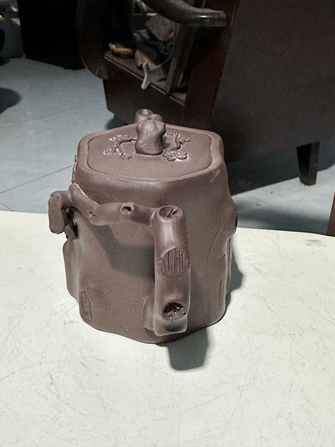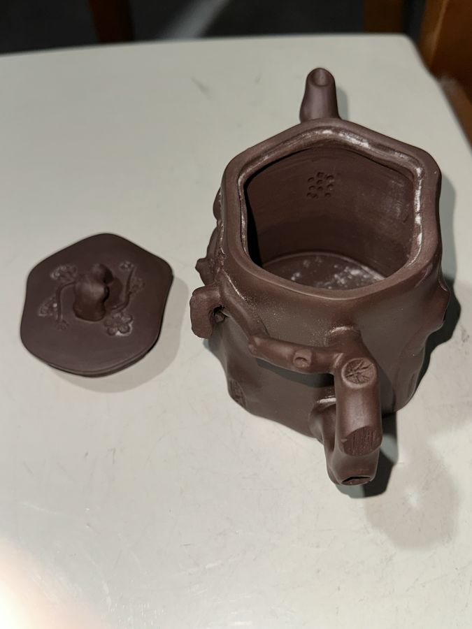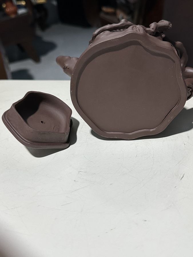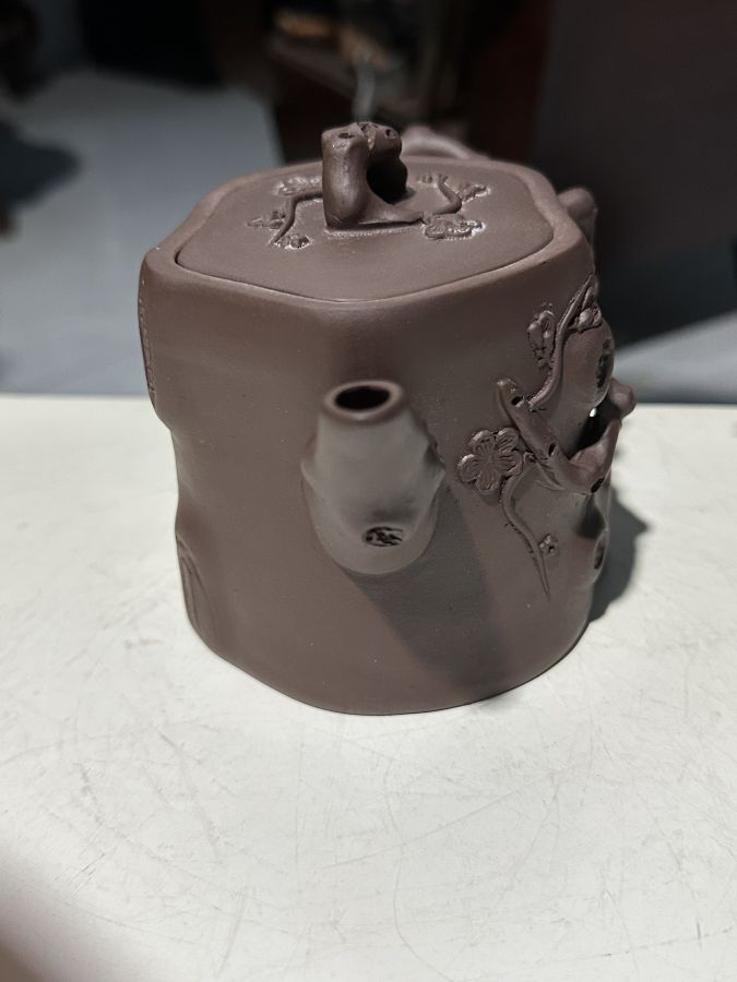 Ấm trà tử sa đấp nổi Cội mai.tuyệt đẹp và chuẩn cổ vật..Từ vòi tới quay 16,5cm, cao 11,5cm, vành nắp vẩy xíu như hình . bán 750 ngàn đồng bao gởi... bán rẻ nhất phố
