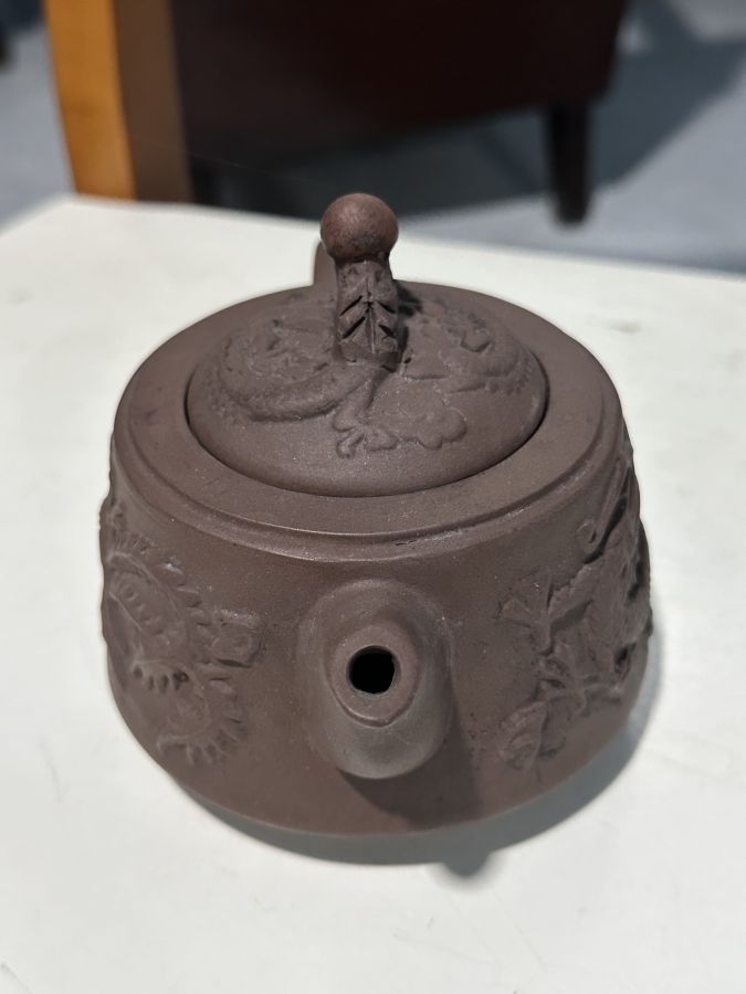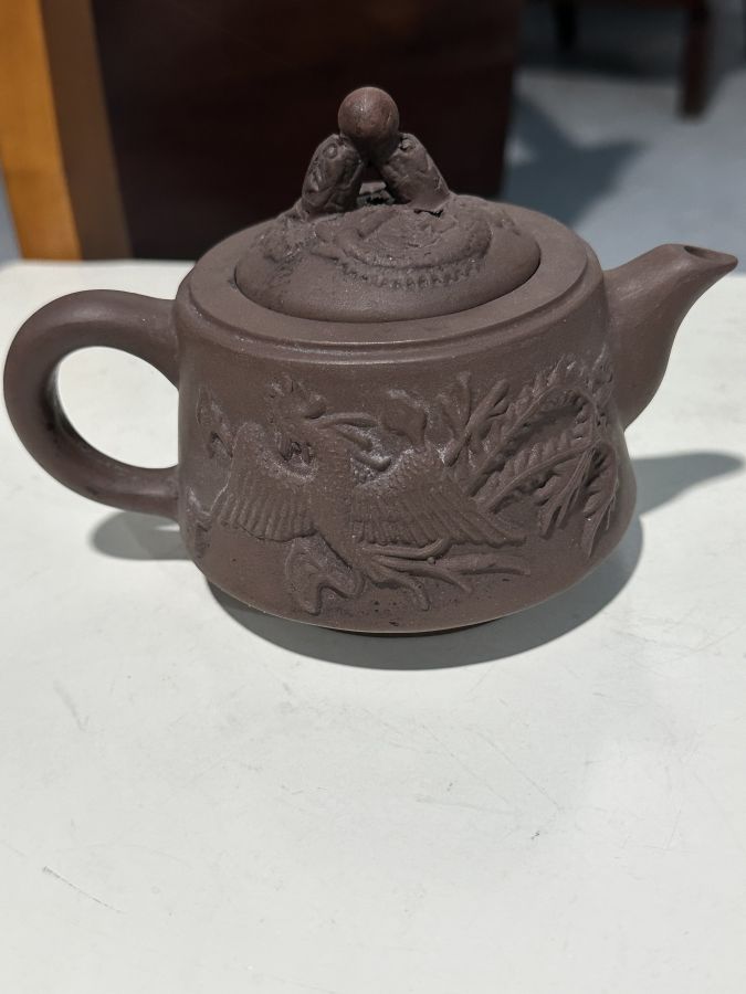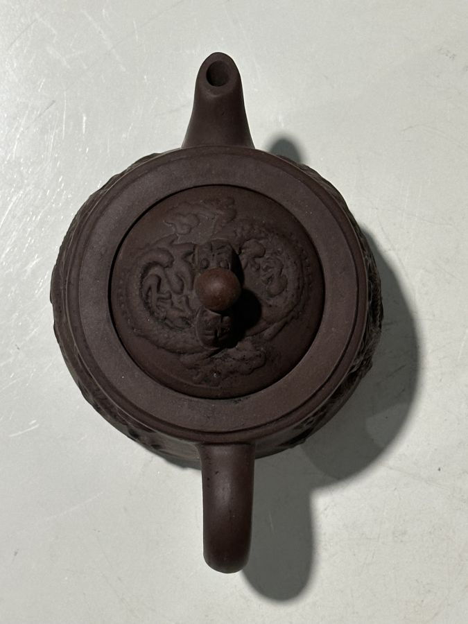 Ấm tử Sa gan gà đất mạnh thần đồ xưa rất đẹp.. đấp nổi tích Long Phụng Hòa minh..Cao 12cm, từ vòi tới quay 17cm... bán 650 ngàn bao gởi