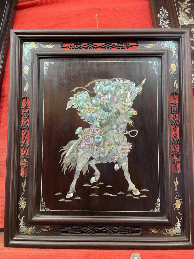 Giao lưu bức quan công cưỡi ngựa gỗ gụ khảm ốc kích thước 65*55 đt 0983491274