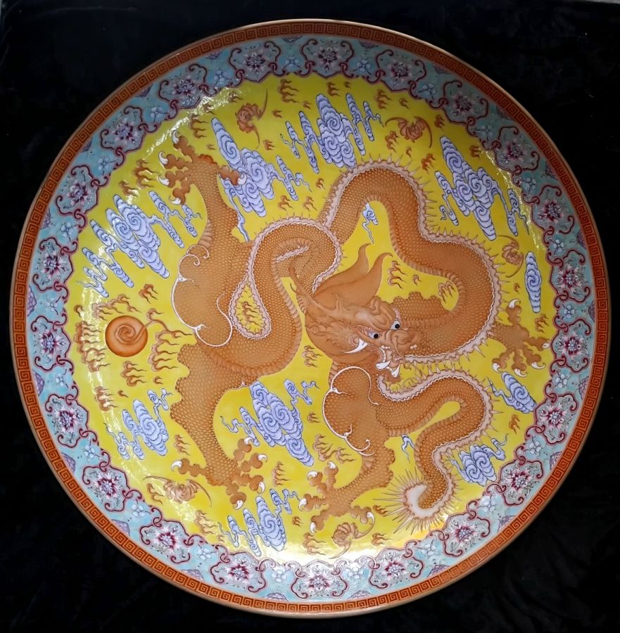 Giao lưu đĩa sứ Tàu vẽ vàng. Hàng kỹ thuật được vẽ bởi họa sư cao cấp Cảnh Đức Trấn