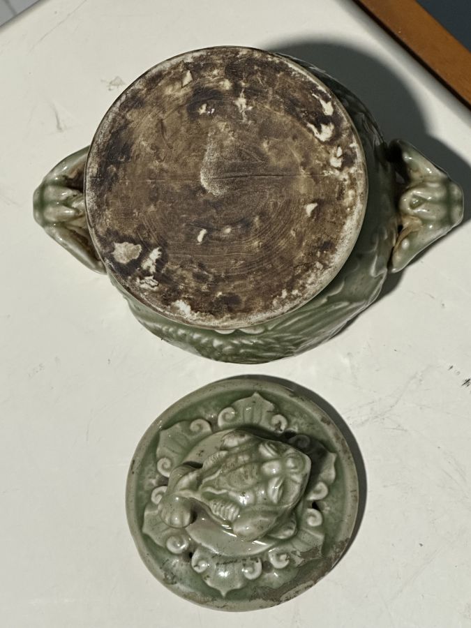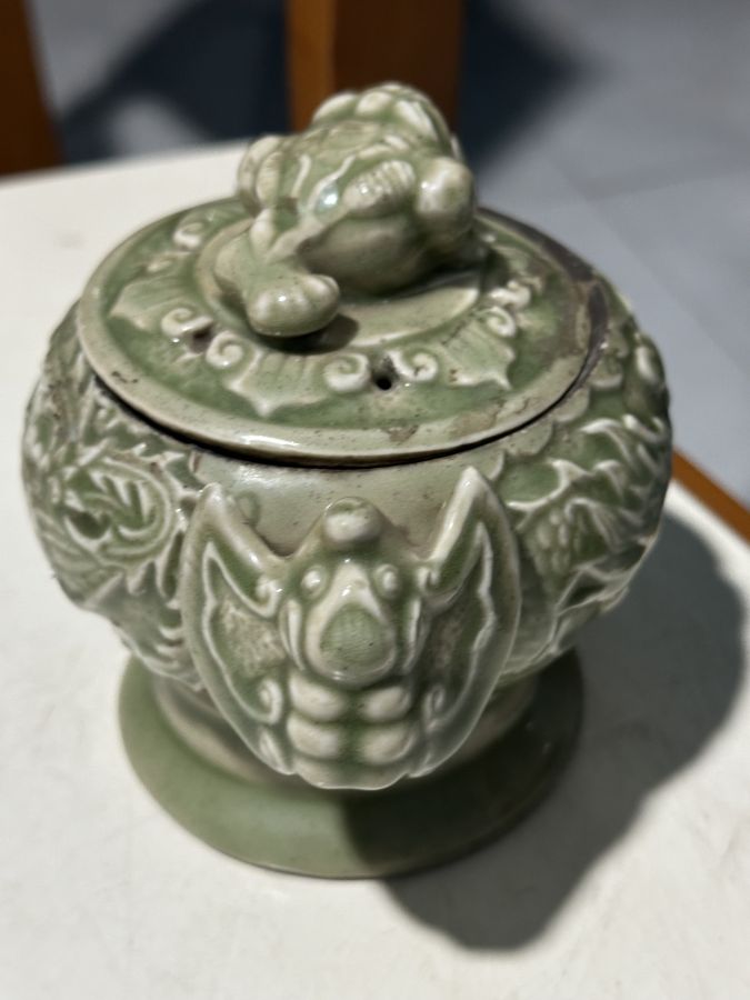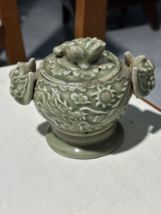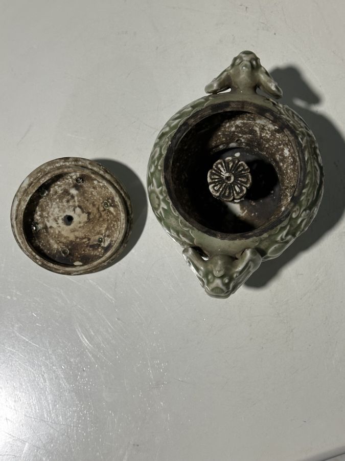 Đỉnh xông trầm độc. Lạ. Hàng khai quật rất sâu tuổi. Người bán bao hàng trên 300 năm.men ngọc thời nhà Lý. Nắp đấp nổi Cóc 3 Đuôi. tạm dịch (Thần Tài) thân đắp Rồng phụng tạm dịch Long Phụng Hòa minh.tay đấp nổi 2 con dơi.. dân chơi gọi là nhị phúc. Bao hàng chuẩn cổ vật.. hiếm gặp Cao 12cm, ngang 2 quay 15cm lành nguyên.. bán 3 triệu 200 ngàn đồng bao gởi.. Ai có cái thứ 2 tặng luôn...Công bảo quản ba mươi mấy năm.. cũng lỗ đấy quý khách ạ...