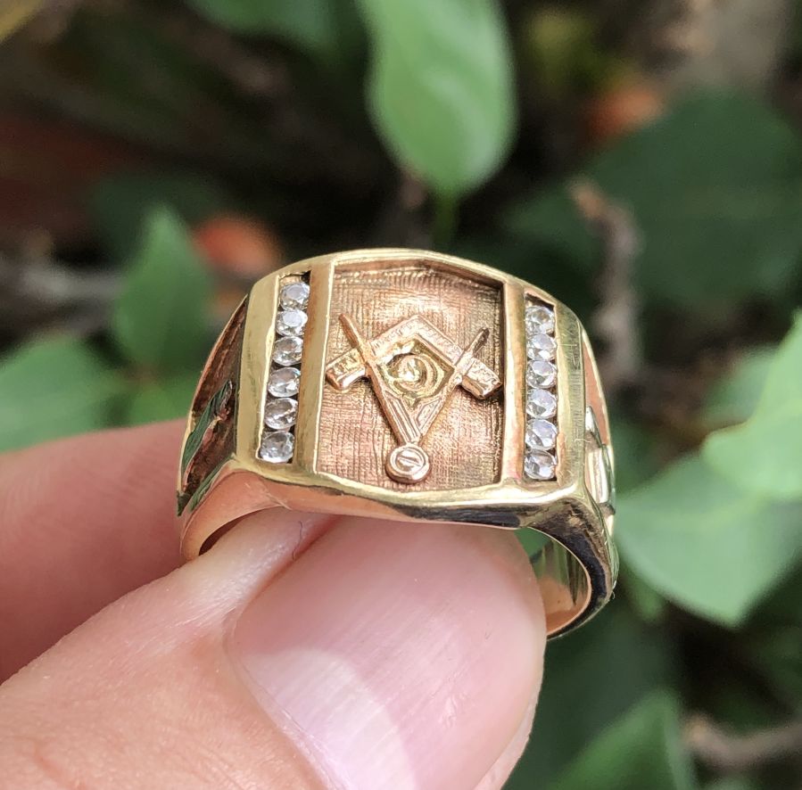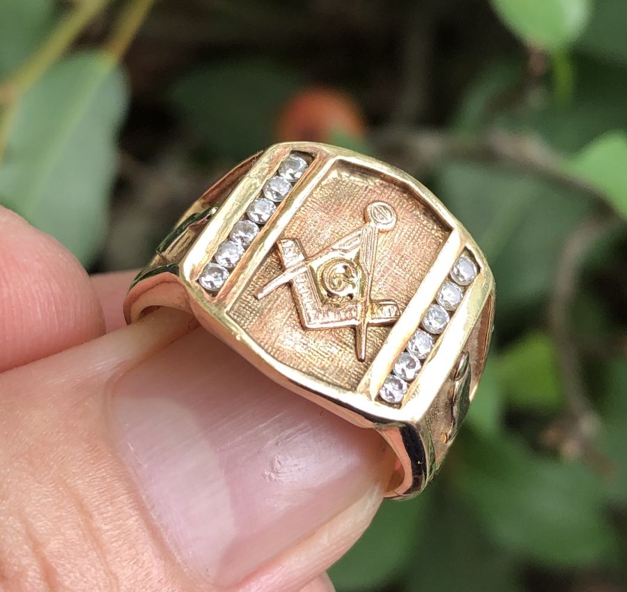 Giao lưu Nhẫn Mỹ Masonic Vàng Hồng 10K. Nguyên zin rất đẹp, chính hãng USA sản xuất. Chi tiết còn khá sắc nét, Mặt đính Kim cương nhân tạo khá đẹp, Logo Masonic đẹp lộng lẫy, sang trọng, sáng tài.