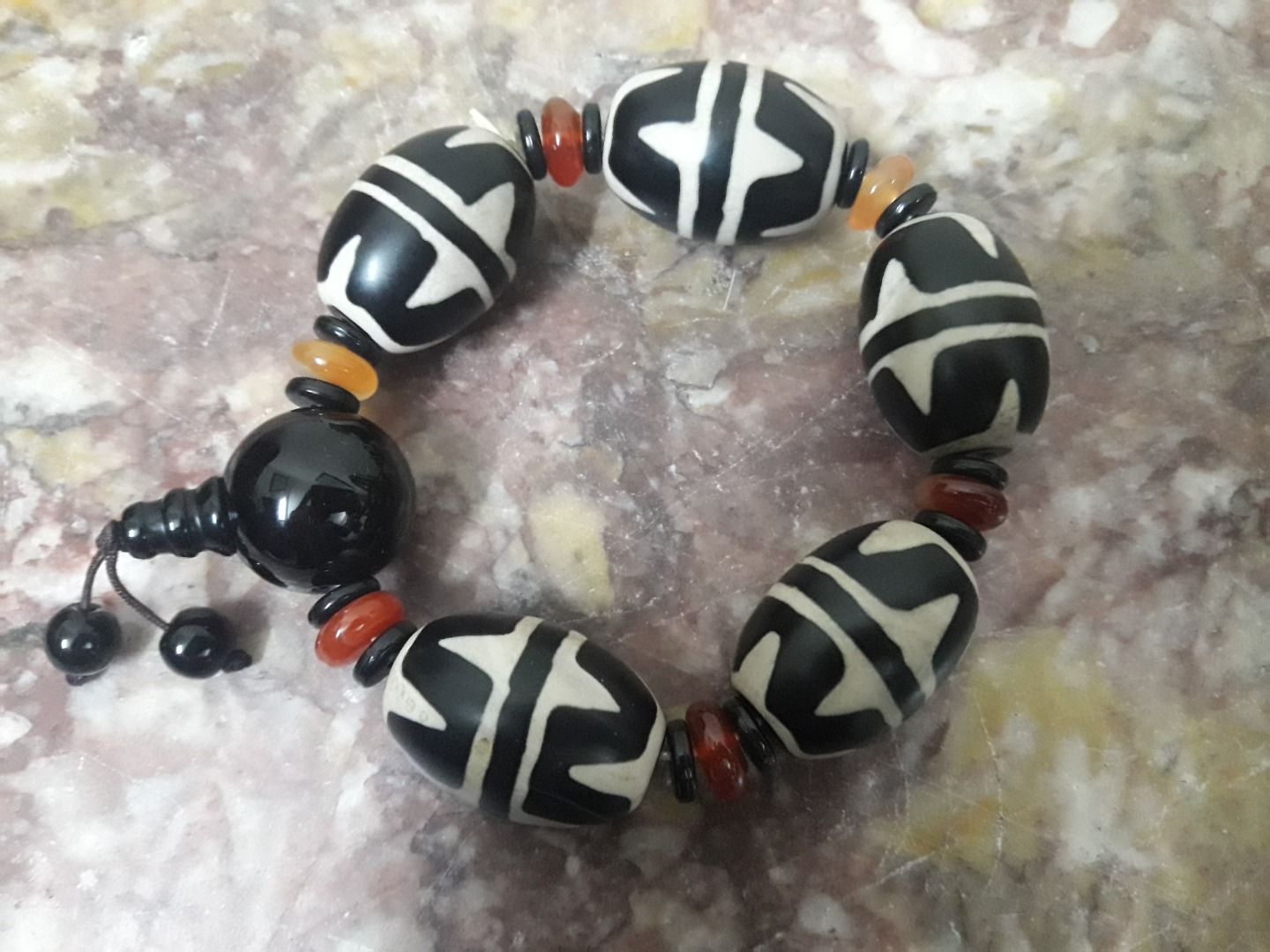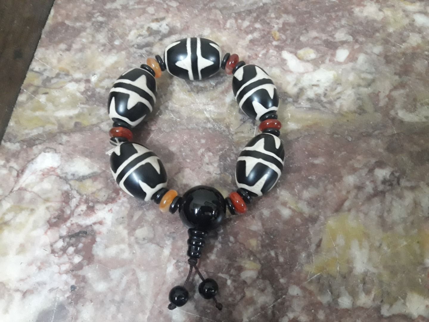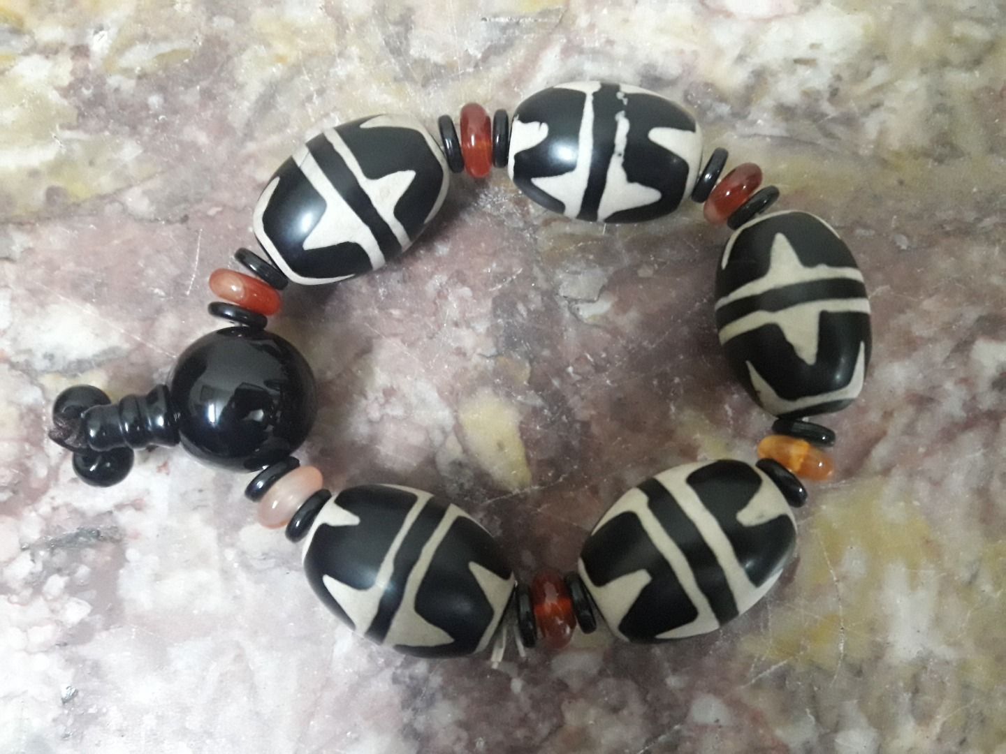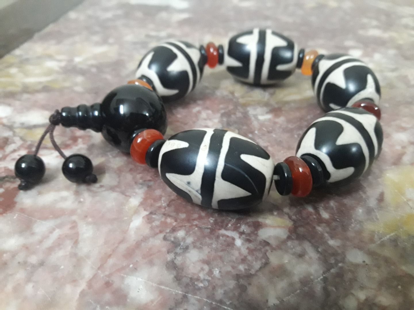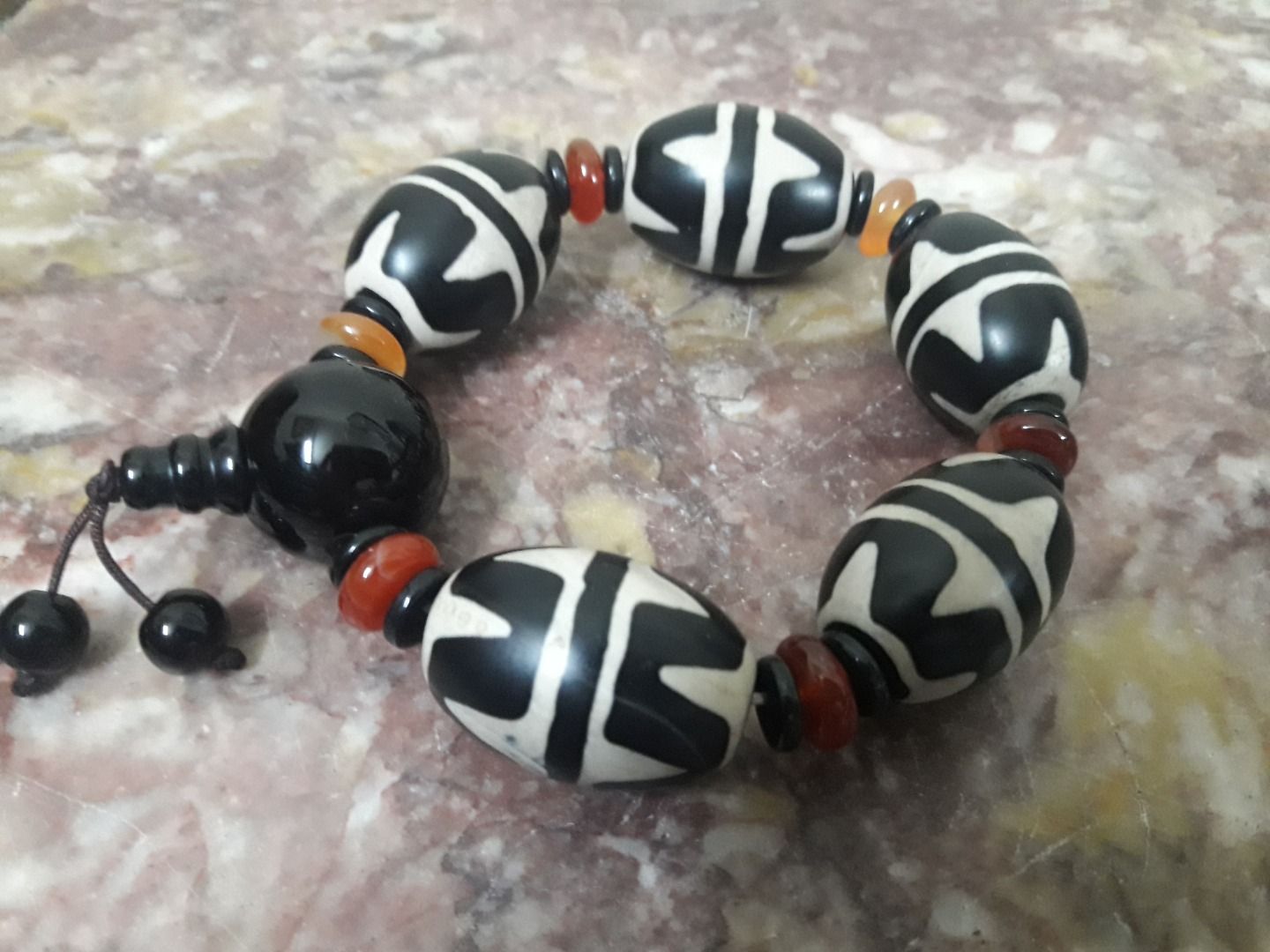 Giao lưu vòng đeo tay đá ngọc dzi thiên châu Tây Tạng , chất đá ngọc cứng ( chà lên kính làm xước sâu kính),tình trạng lành nguyên vẹn, viên màu nâu và 2 viên nhỏ điểm thêm là đá mã não.Hạt loại lớn .Dùng đeo tay phong thủy thì tuyệt vời .Giá giao lưu 1tr850k.Kính phố