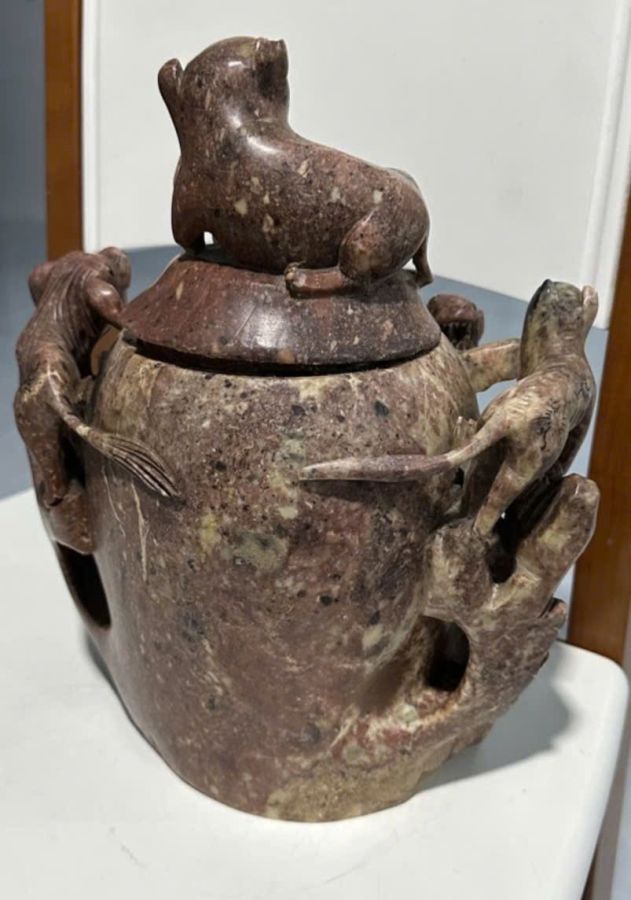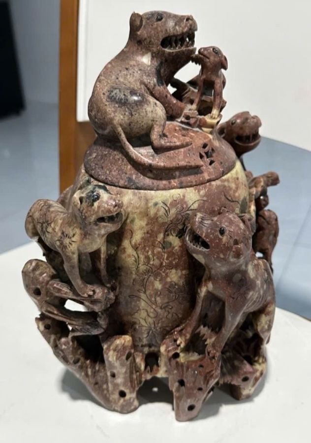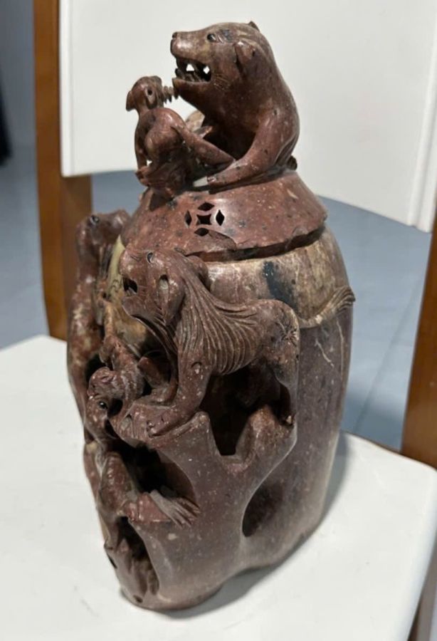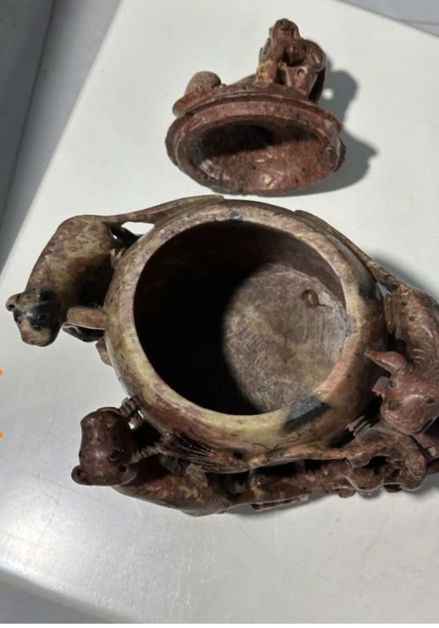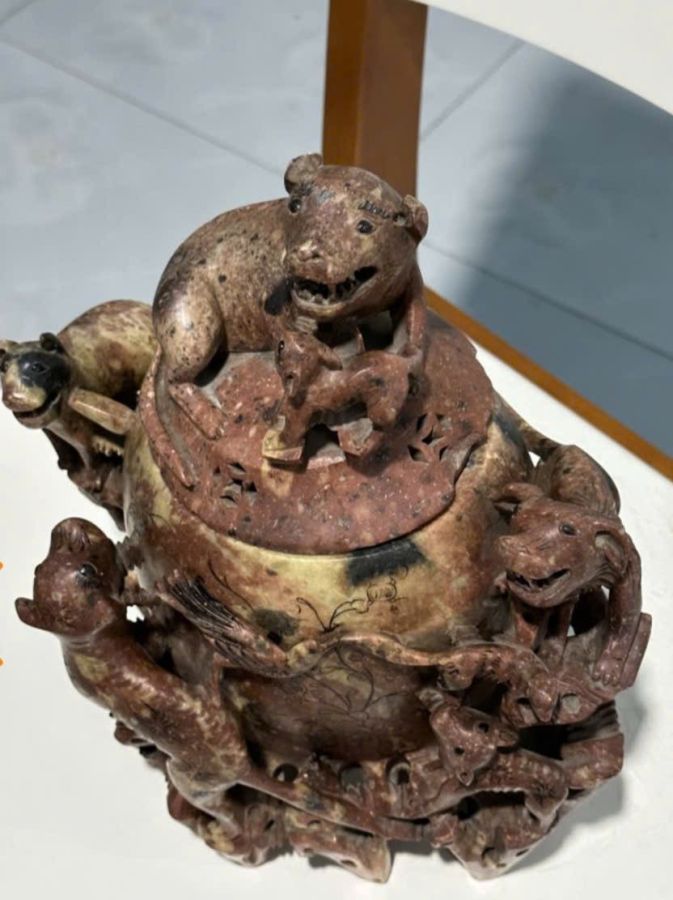 xông trầm đá huyết.. Đồ Tàu đá Thọ Sơn.. chạm Khắc chim, thú .. tuyệt đẹp và hiếm gặp. tình trạng như hình. Cao 27,5cm, ngang 25cm... giao lưu 9 triệu 500 ngàn bao gởi.cam kết hàng chuẩn cổ vật..