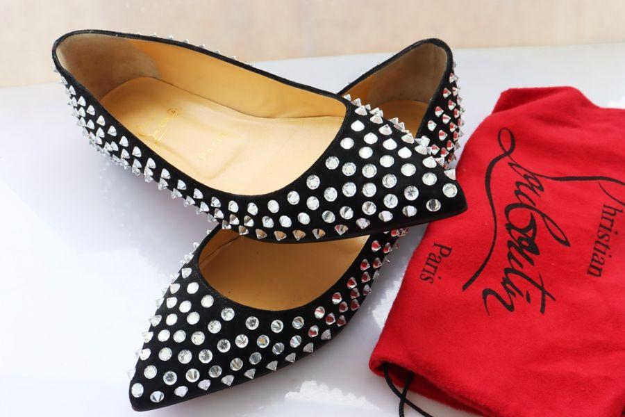 Giày nữ bệt Louboutin Paris ( Thương Hiệu Pháp ) Da đen đính đinh cường chiếu 56070