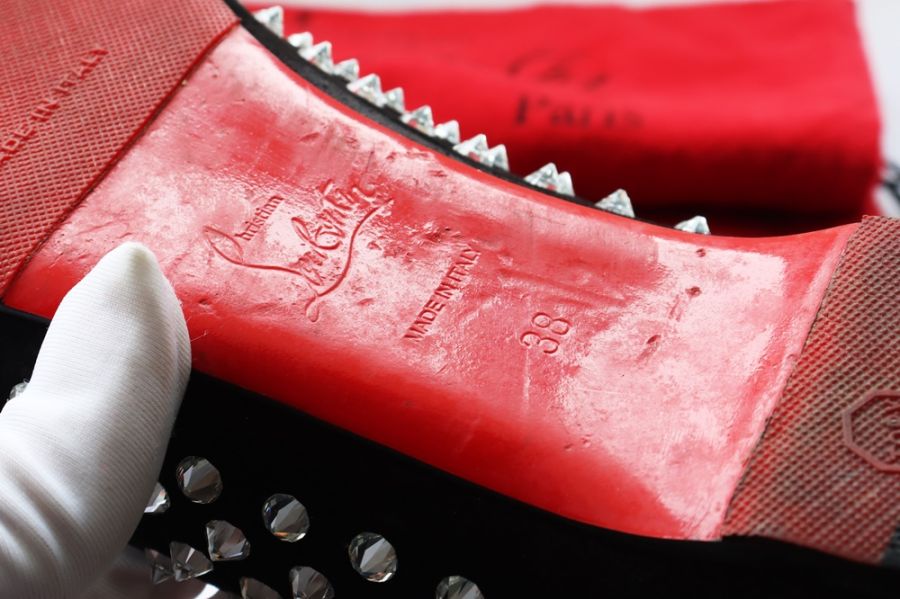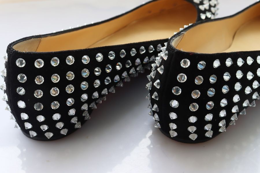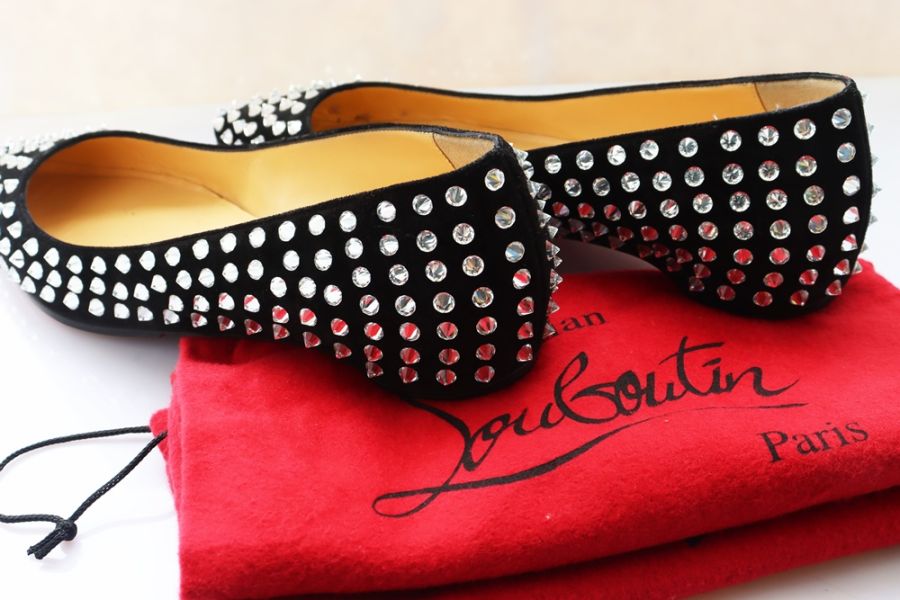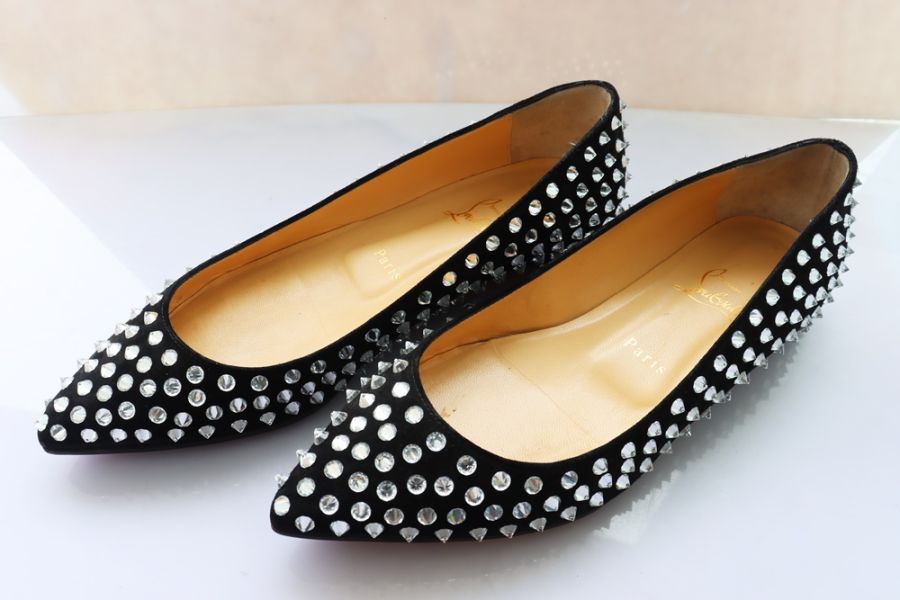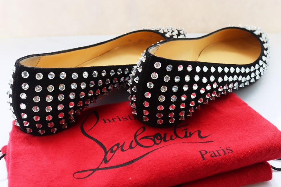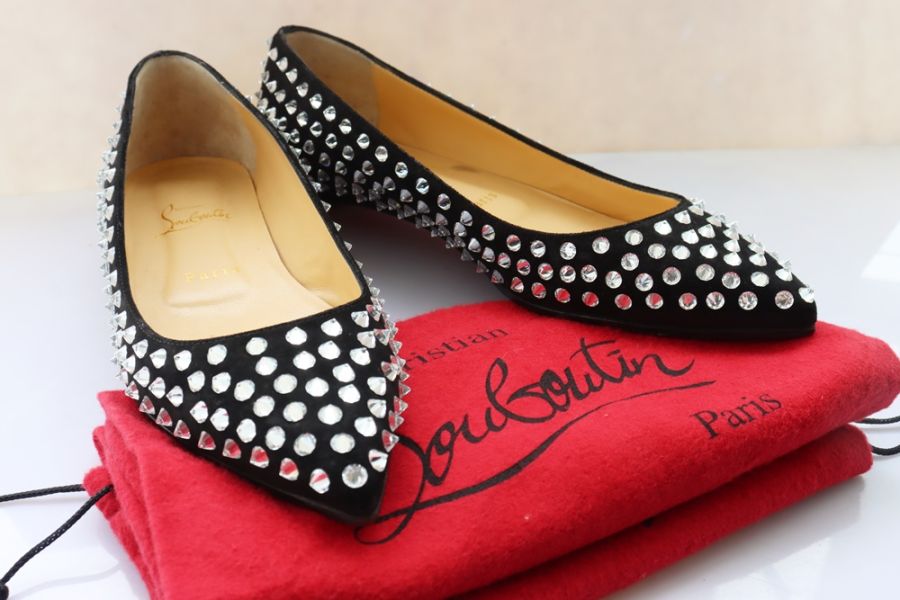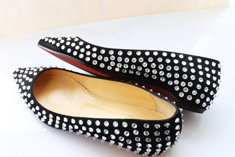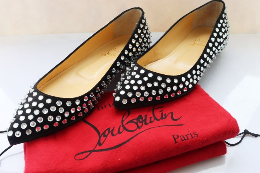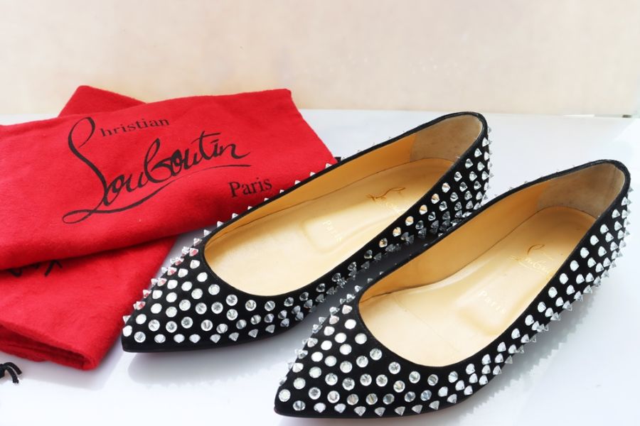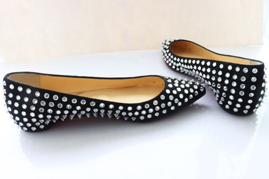 Giày nữ bệt : Louboutin Paris ( Thương Hiệu Pháp ) Da đen đính đinh cường chiếu ( Full túi đựng )