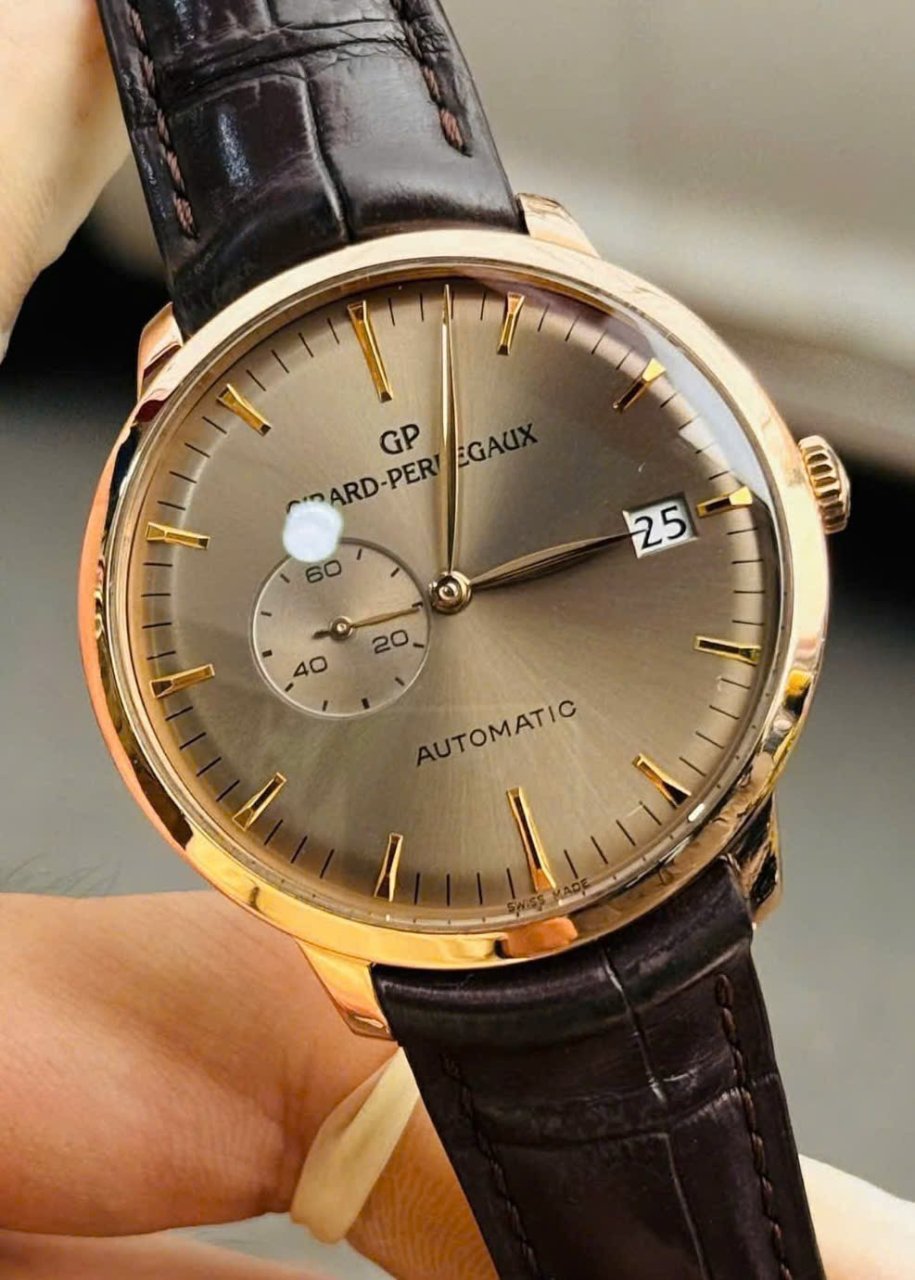 - Dial mặt số trải tia tinh tế,tông màu nâu Chocolate - tông màu hoàn hảo đi kèm với bộ vỏ bằng vàng hồng.