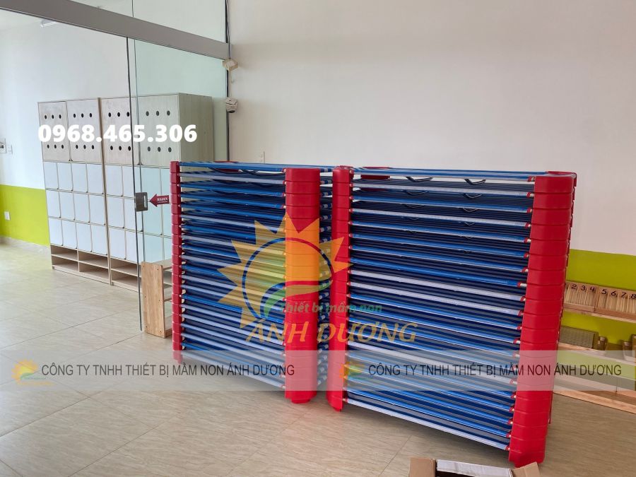 Khung giường làm bằng sắt kẽm phi 21, dày 1.2 ly, có giá đỡ bằng inox, chống cong võng khung giường, đảm bảo an toàn cho bé.