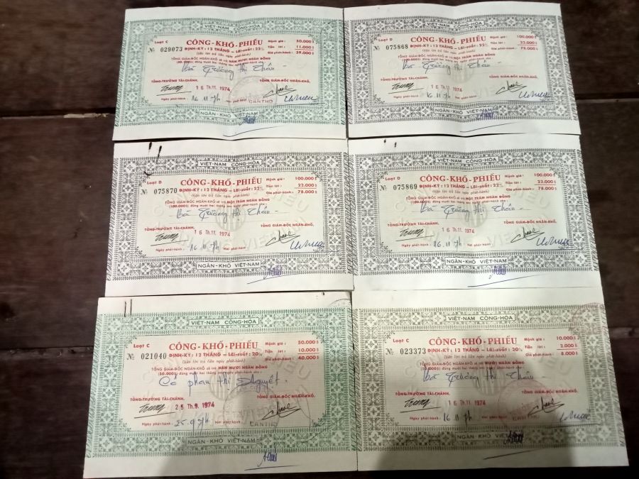 Gluu 6 tờ công khố phiếu xưa từ năm 1974.