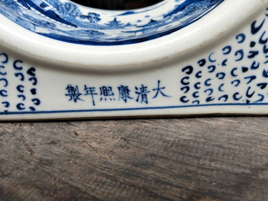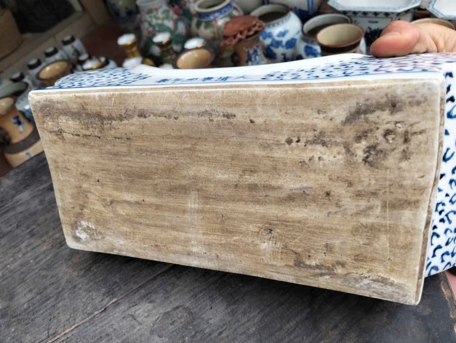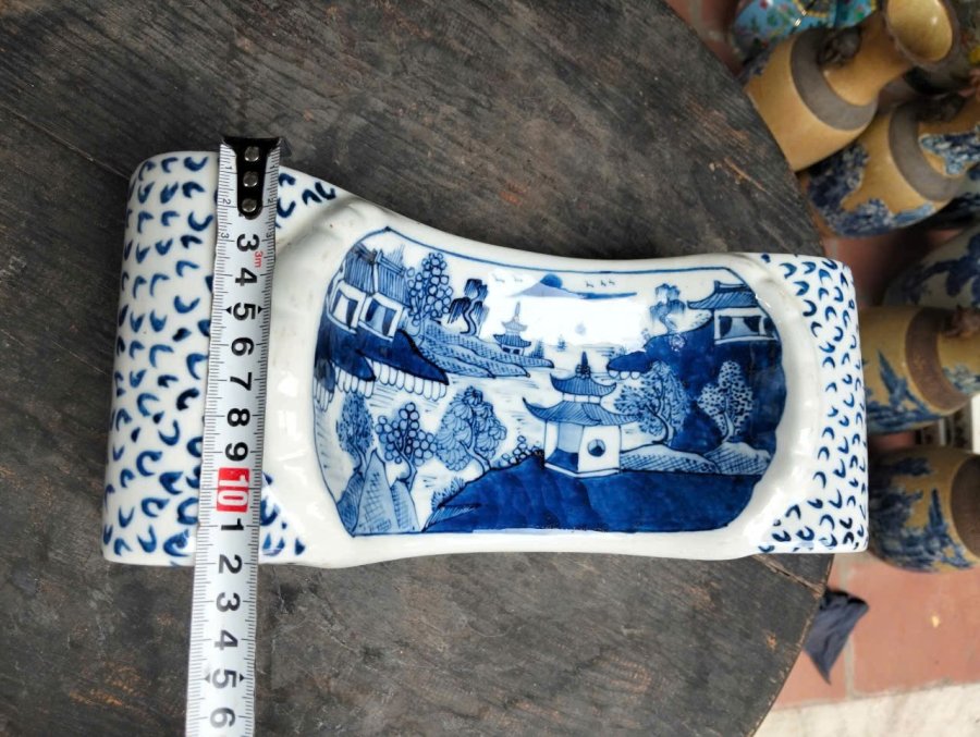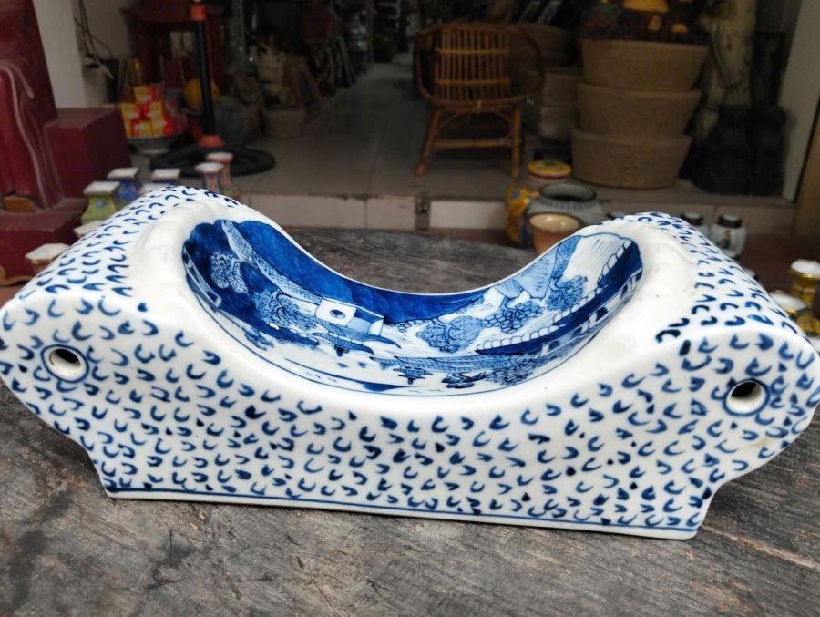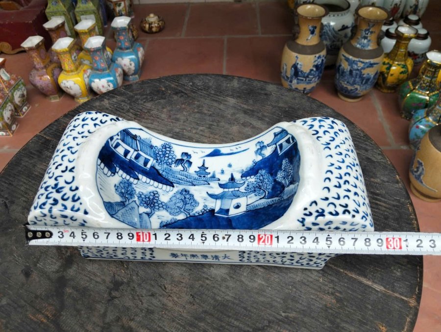 Gối sứ Tàu cũ dáng độc lạ , vẽ Sơn Thủy Hữu Tình rất đẹp , thân hiệu đề 6 chữ : Đại Thanh Khang Hy Niên Chế , già đồ , lành tít, đáng để sưu tập.
