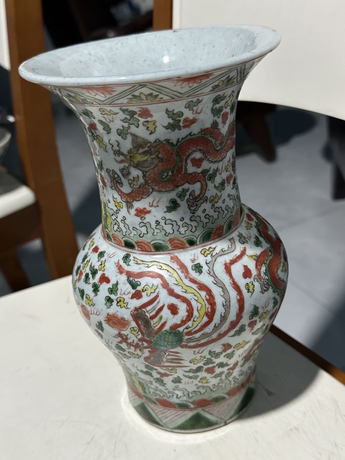 Lộc Bình bá huê Tôn men chàm rất đẹp trôn trổ màu ten đồng loại này rất quý hiếm. Đời nhà Minh bao hàng trên 300 năm chuẩn cổ vật.. vẽ tích (Long Phụng Hòa minh) tạm dịch (Rồng Bay phụng múa)rất đẹp và hiếm gặp. Cao 22,5cm, miệng 13,5cm. Trình trạng vẩy thật nhẹ trên miệng.. không đáng kể.. thân bình lành nguyên.. Bán rẻ cho anh.3 triệu 500 đồng bao gởi... không chuẩn cổ thường gấp đôi.. trên phố có ai bán dám cam đoan với các bạn bao hàng như thế này không ạ?????💯💯💯💯💯