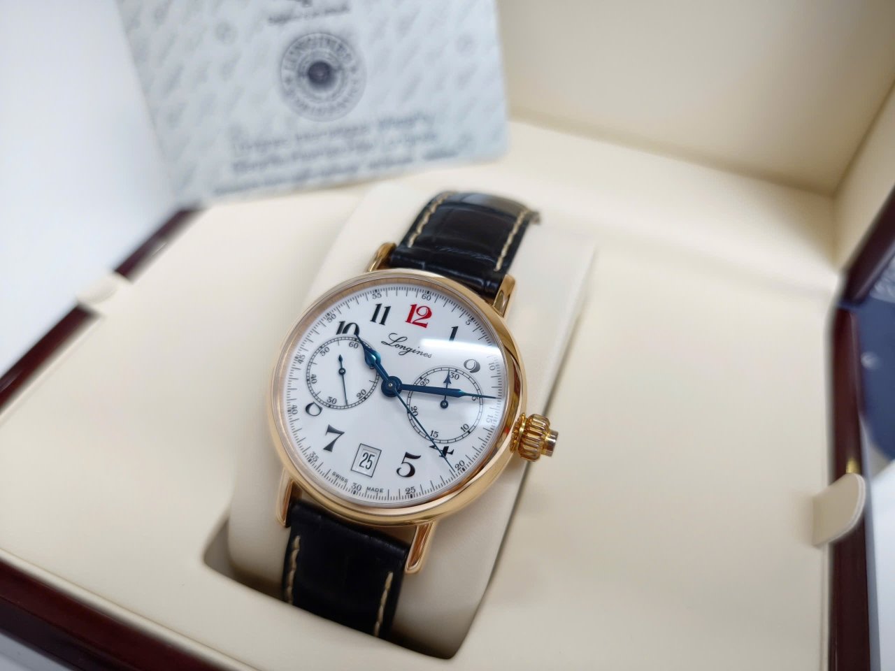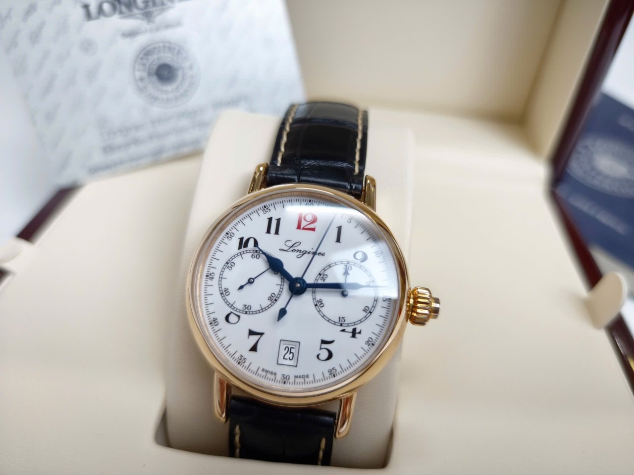 Hàng siêu khủng Longines Heritage Chronograph L2.775.8.23.3 Solid 18K Rose Gold kim xanh nung tuyệt đẹp