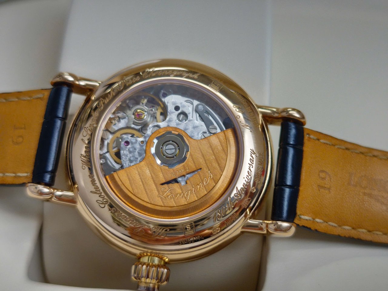 - Sử dụng bộ máy Caliber L788.2 mới nhất của Longines được đúc nguyến khối Vàng hồng 18K. Đáy sau lộ máy giúp các quý ông có thể chiêm ngưỡng cỗ máy Longines cal L788 với 27 chân kính, 28800 tần số dao động và khả năng trữ cót 54 tiếng