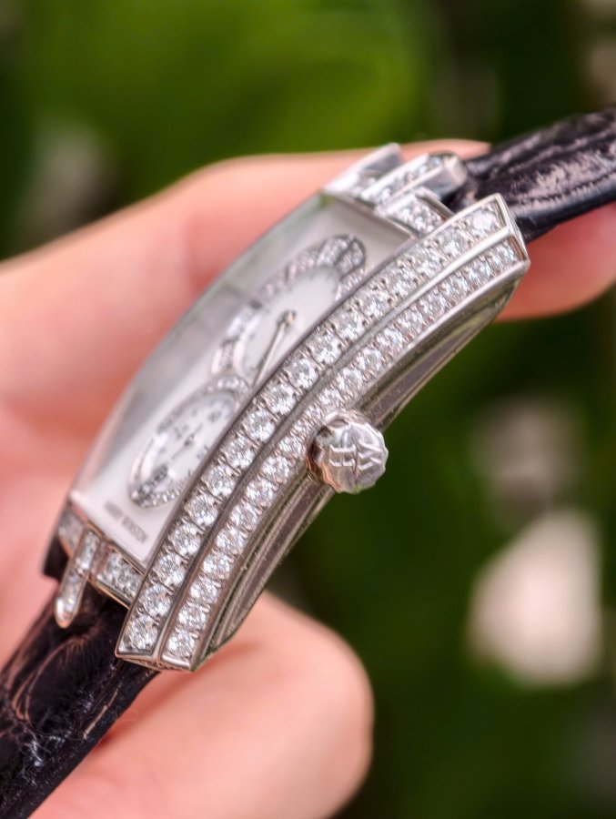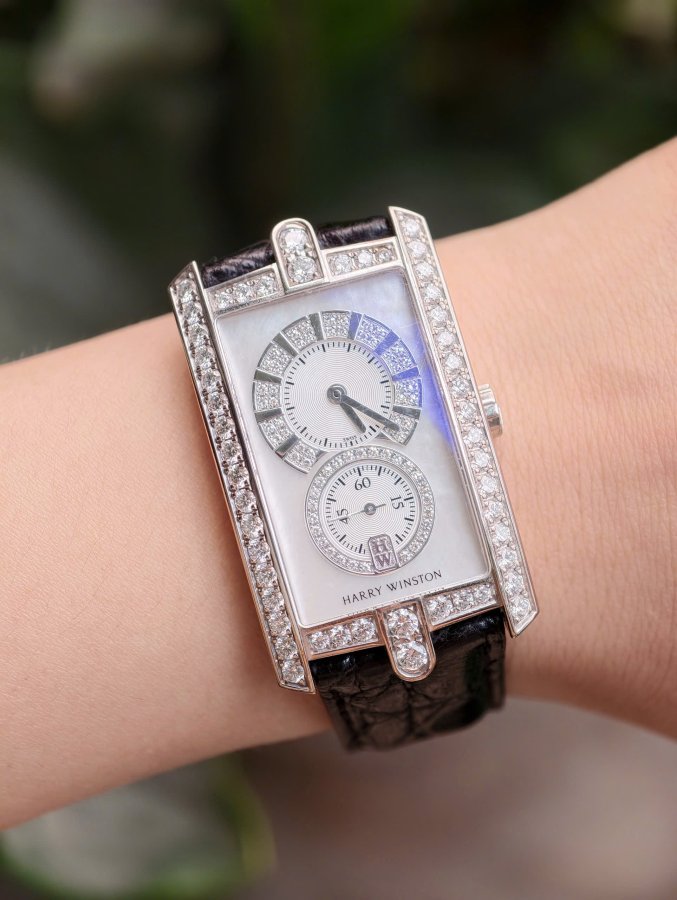 Harry Winston Avenue C MidsizeSize 26x37mmRef: 331.UQWL.MD.D3.1 Máy quartzVàng trắng 18K nguyên khối, đính kim cương zin hãng và xà cừ.
