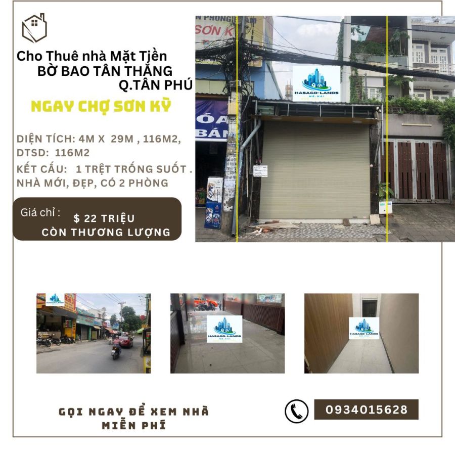 CỰC HIẾM - Cho thuê nhà Mặt Tiền Bờ Bao Tân Thắng 116m2, 22Triệu - NGAY CHỢ