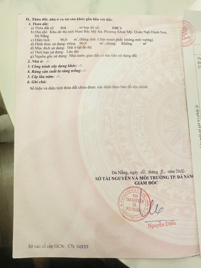 Cần bán lô đất tâm huyết đường Hoàng Trọng Mậu phường Khuê Mỹ! Diện tích: 90m2 (5x18) Hướng NAM siêu mát. Đường quy hoạch: 7m5, vỉa hè 4.5m (Đậu đỗ ô tô thoải mái). Đi bộ tới trường Tiểu học Trần Quang Diệu. Chợ búa, mua sắm thả ga: 5 phút tới chợ Bắc Mỹ An & Siêu thị Lotte Mart, Helico. An tâm sức khỏe: Gần ngay Bệnh viện Quận & Bệnh viện Tâm Trí. Tiềm năng cho thuê: Nằm sát khu Làng Đại học (ĐH Kinh Tế), nhu cầu thuê trọ/căn hộ cực cao.