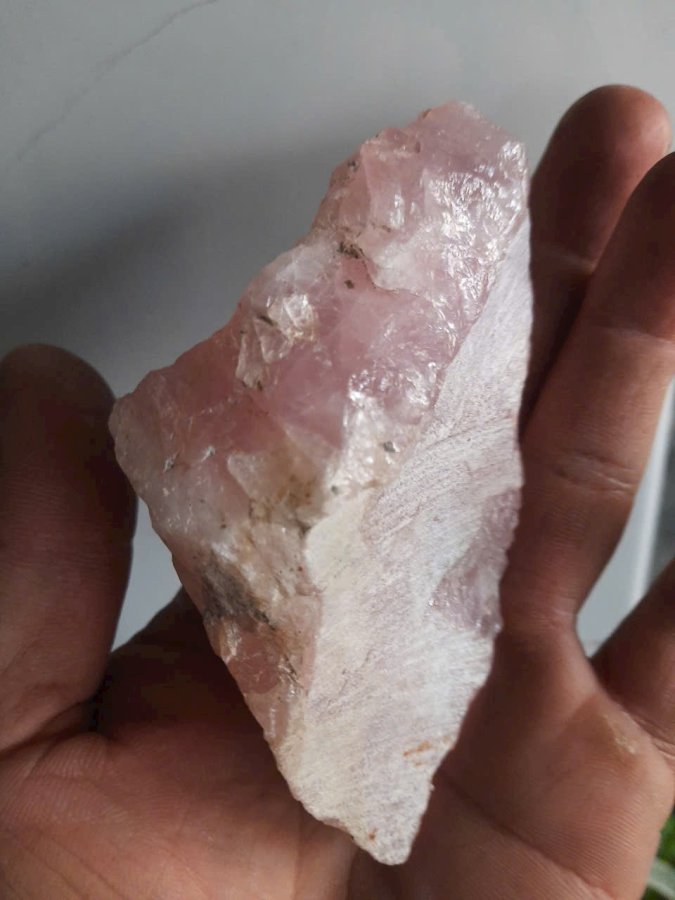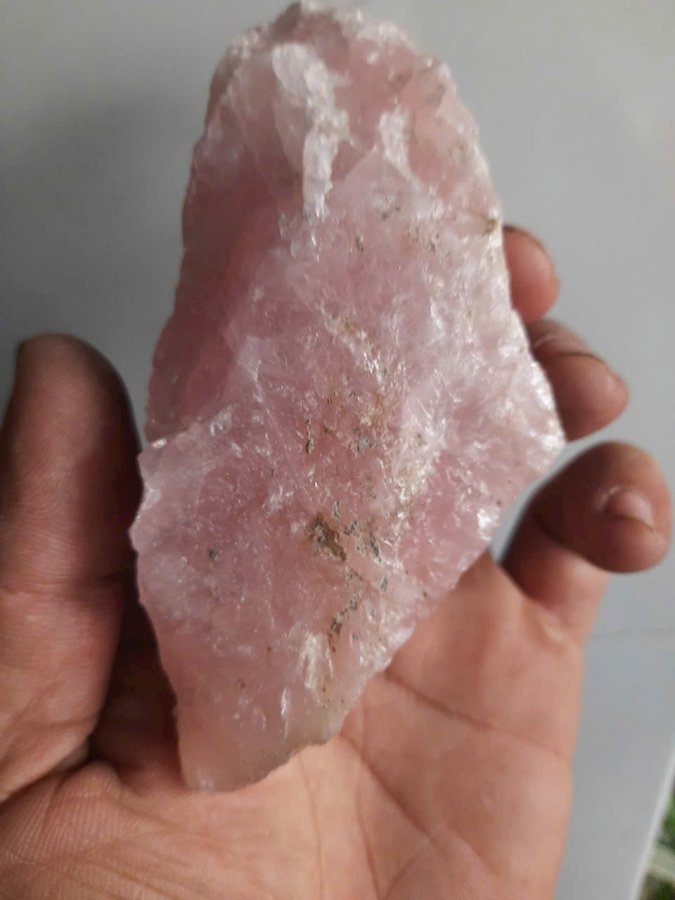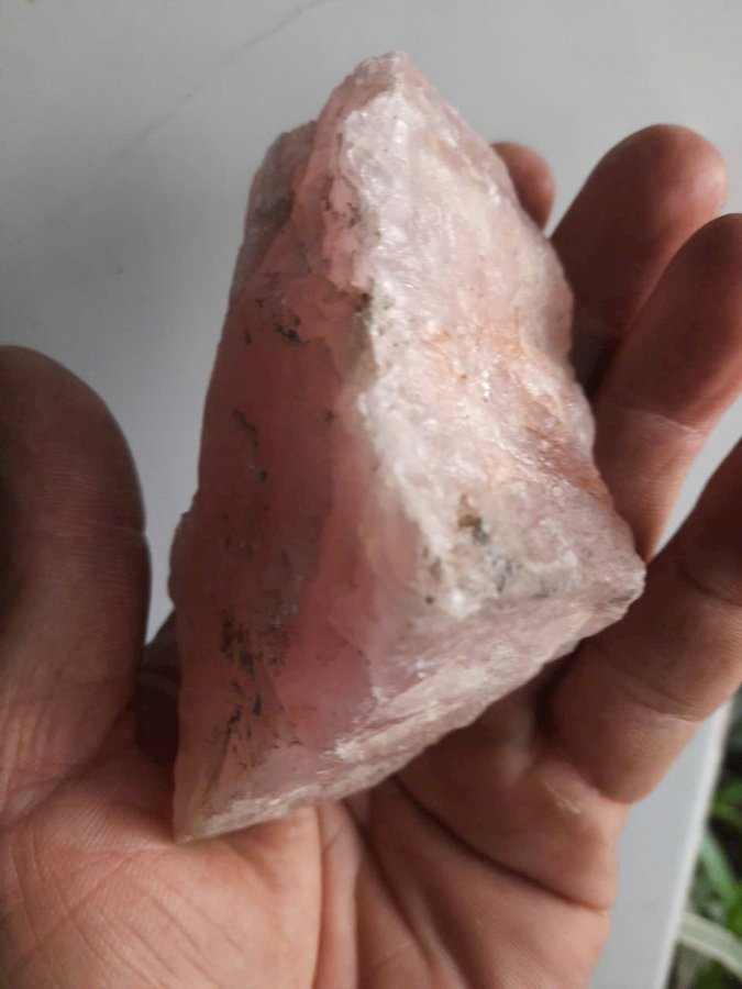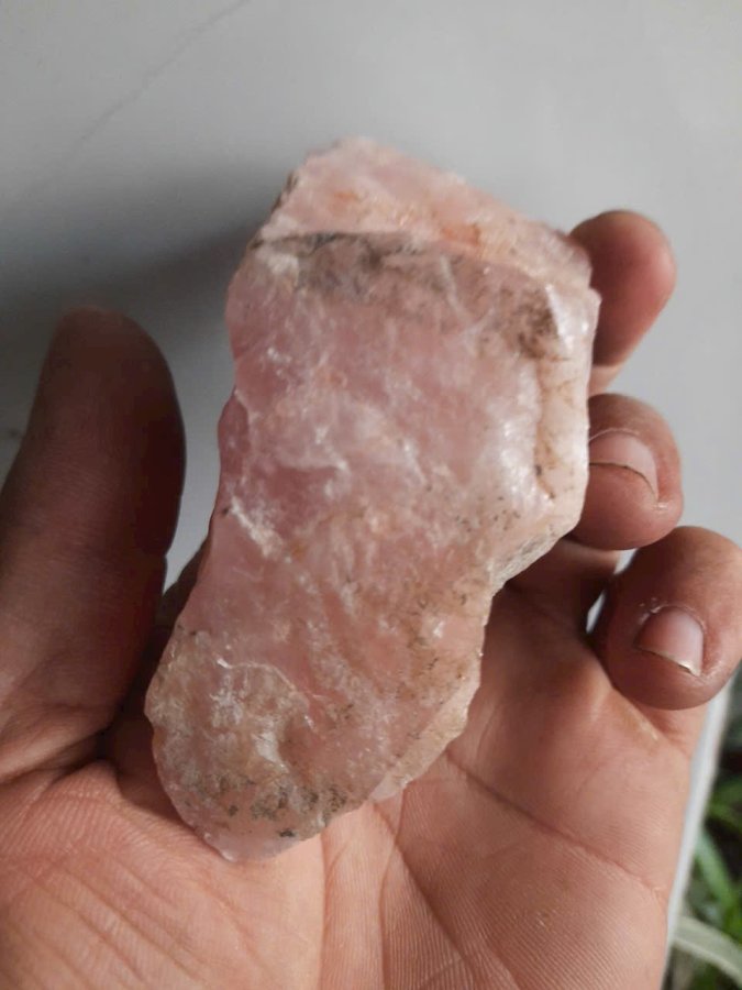 Hòn đá thạch anh hồng nguyên bản chưa qua chế tác. Dài 11cm. Lành đẹp. Thấu quang tốt.