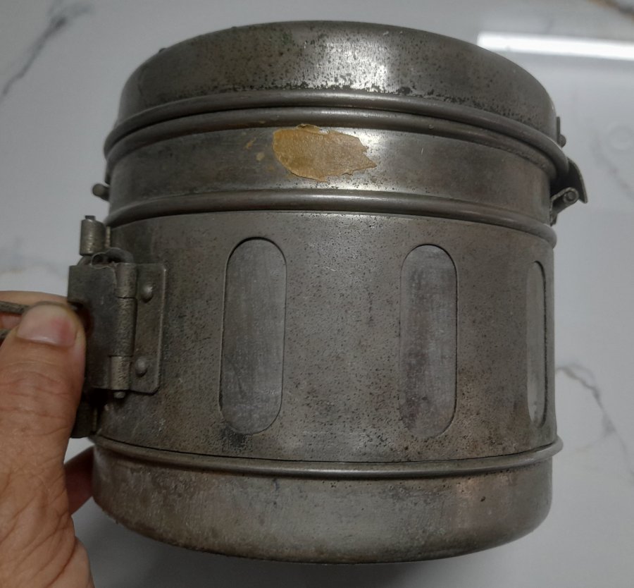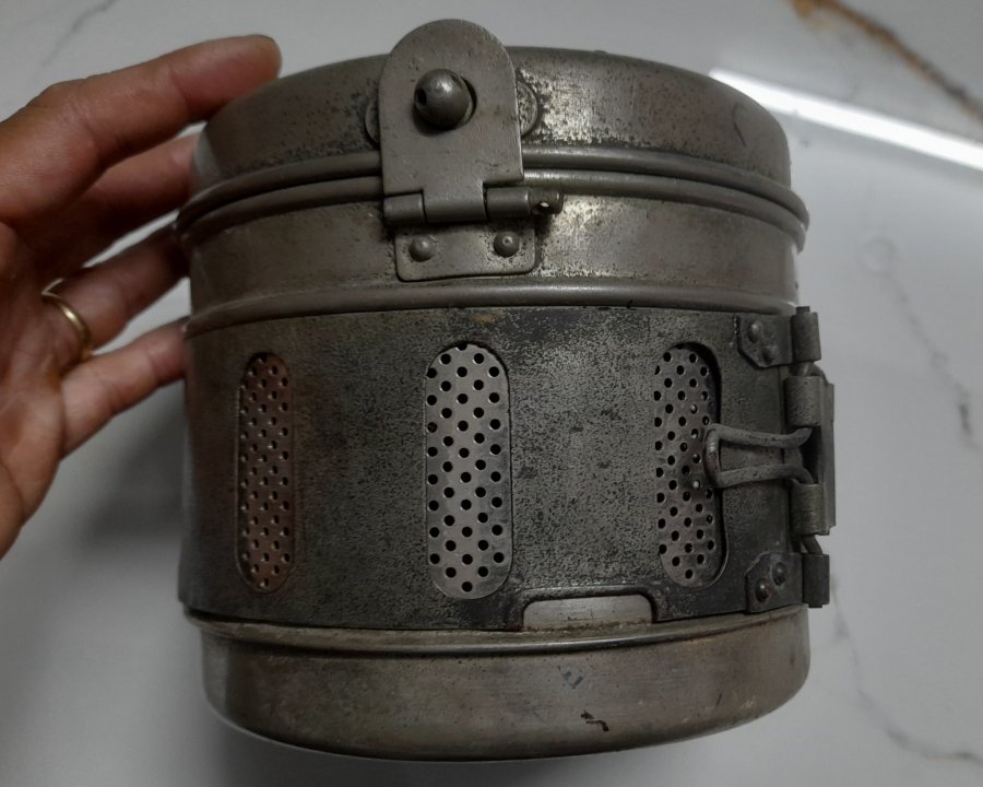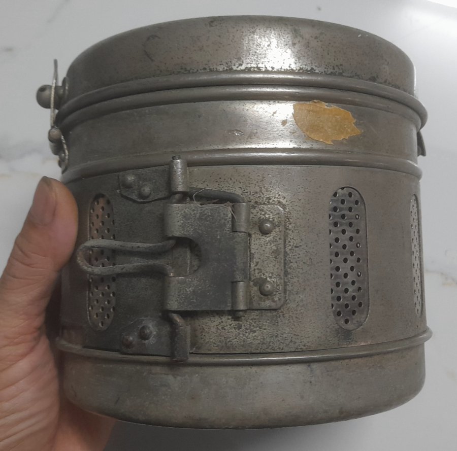 Hộp hấp khử trùng dụng cụ y tế xưa bằng đồng bạch (đồng mạ Niken). Đường kính thân khoảng 17cm x cao khoảng 14cm...