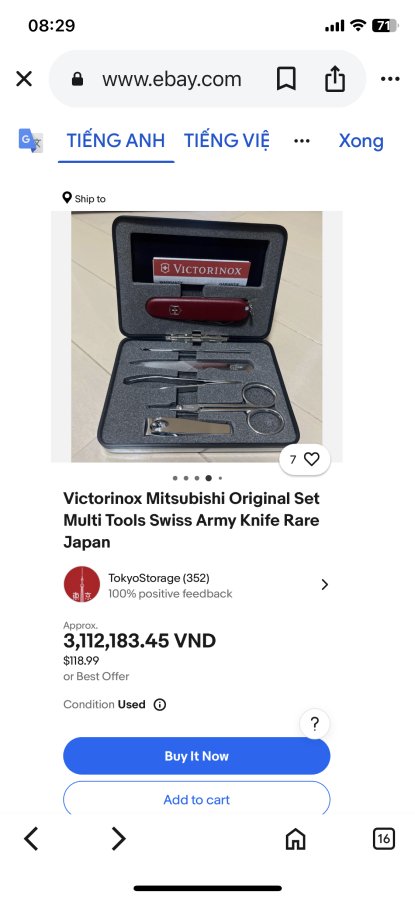 Hộp đựng dụng cụ cá nhân Victorinox,hàng còn mới chưa thấy dấu sử dụng,nhưng hàng Nhật về trong tình trạng không đủ bộ và hộp có bị cấn móp,anh chị khéo tay mua về gò lại cho đẹp và thêm vài món đồ vào là đủ bộ để sử dụng.Thiếu kính,kéo tỉa lông mũi và dũa,dũa thì em có dũa rời trùng bộ tặng kèm cho anh chị khi mua.Hàng có giá trên EBay khá cao.Cảm ơn đã xem tin