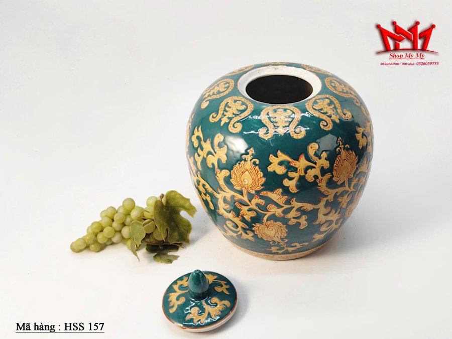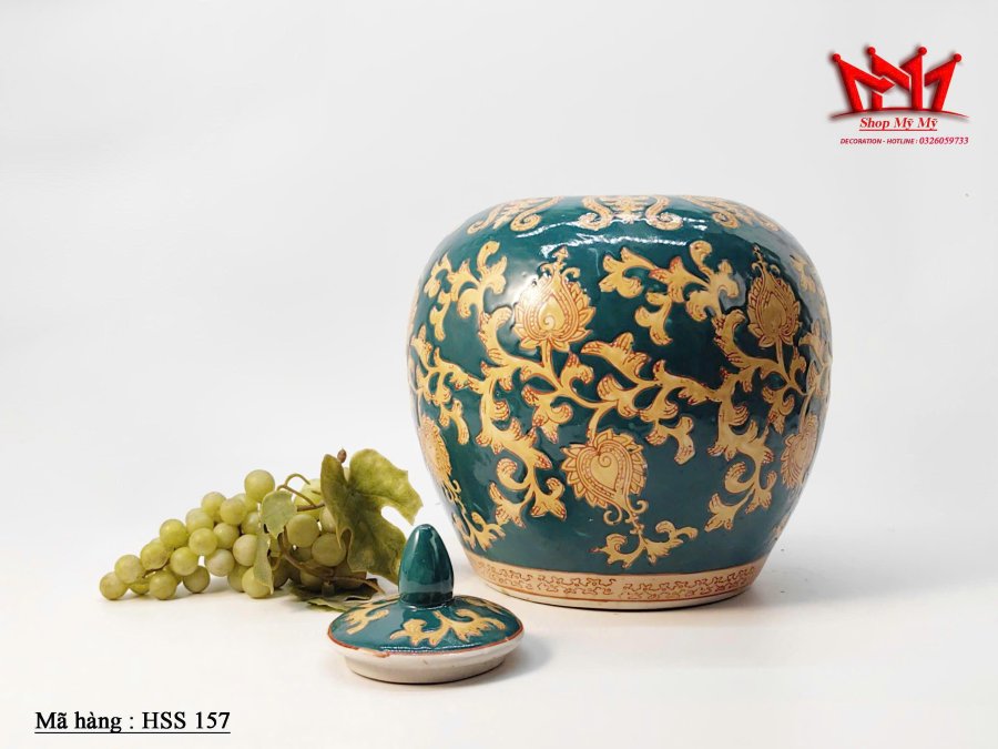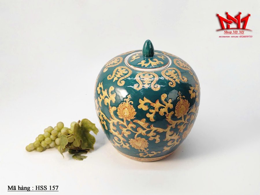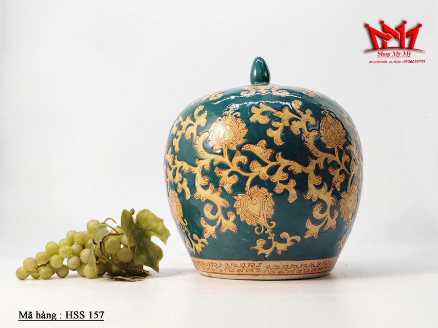 Chiếc hũ đựng gừng bằng sứ mang phong cách truyền thống Trung Hoa, nổi bật với sắc men xanh ngọc và hoa văn vàng vẽ tay tinh tế. Thiết kế tròn đầy phúc khí, kết hợp nắp chóp gọn đẹp, tạo nên món decor sang trọng và giàu giá trị thẩm mỹ.