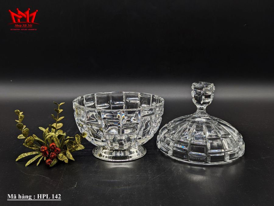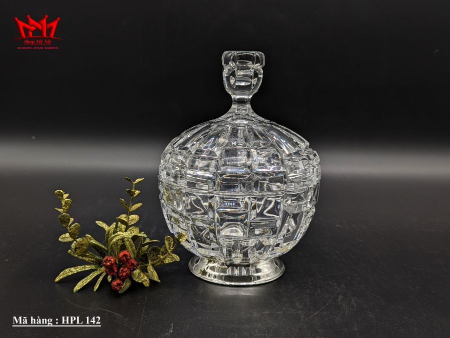 Hủ đựng kẹo bằng pha lê trong suốt có chân mạ bạc cổ điển có nắp đậy.