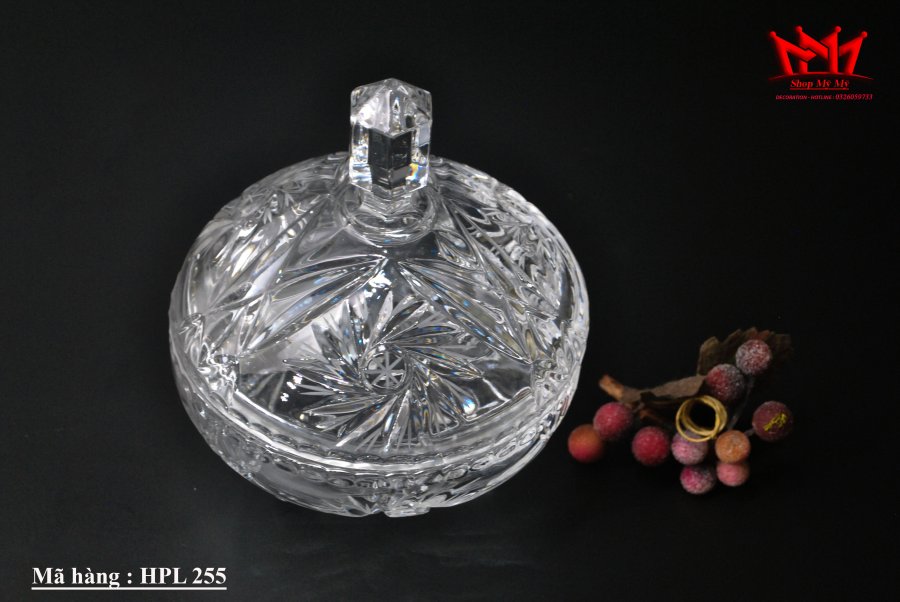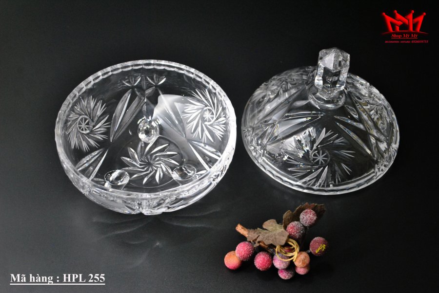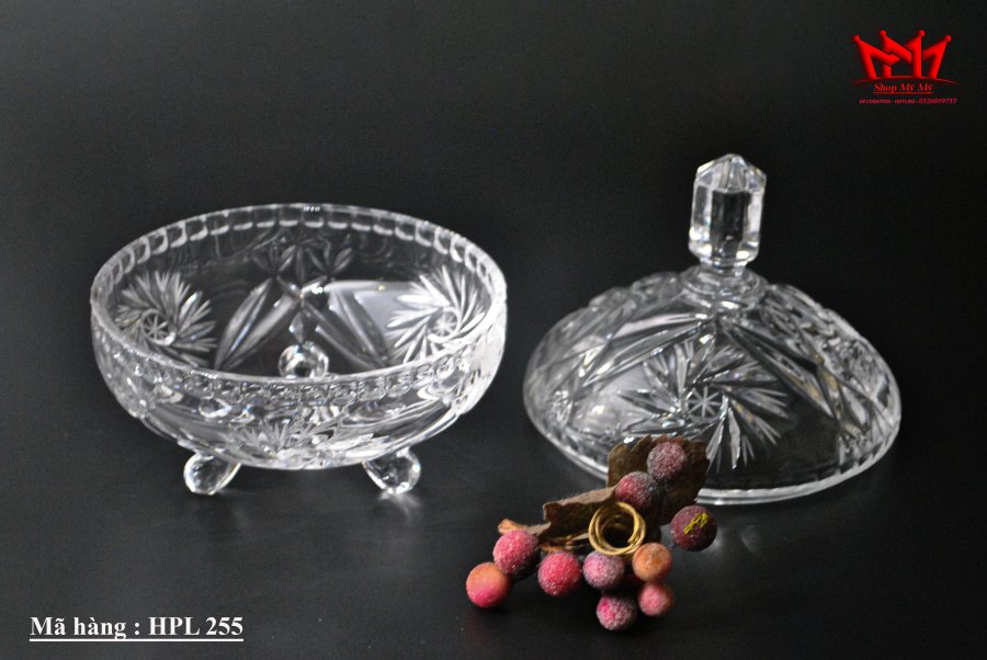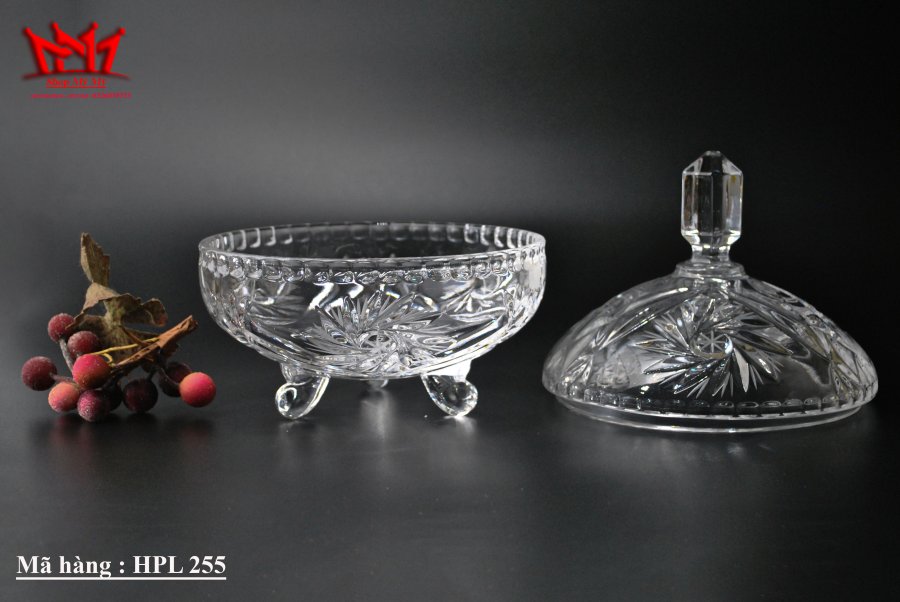 Hủ pha lê có 3 chân họa tiết mài dùng để đựng kẹo, bánh mứt .