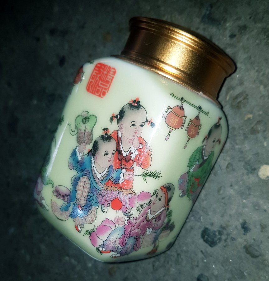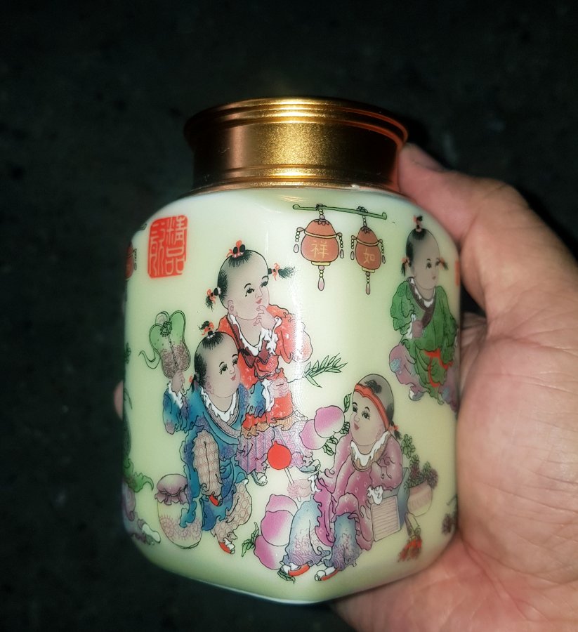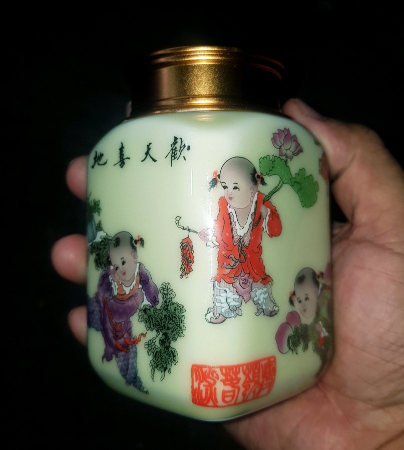 Hũ trà mini điển tích tiểu đồng vui trung thu. Hũ trà chỉ cao 12cm. nắp kim loại có ren xoáy kín khít. GL450k
