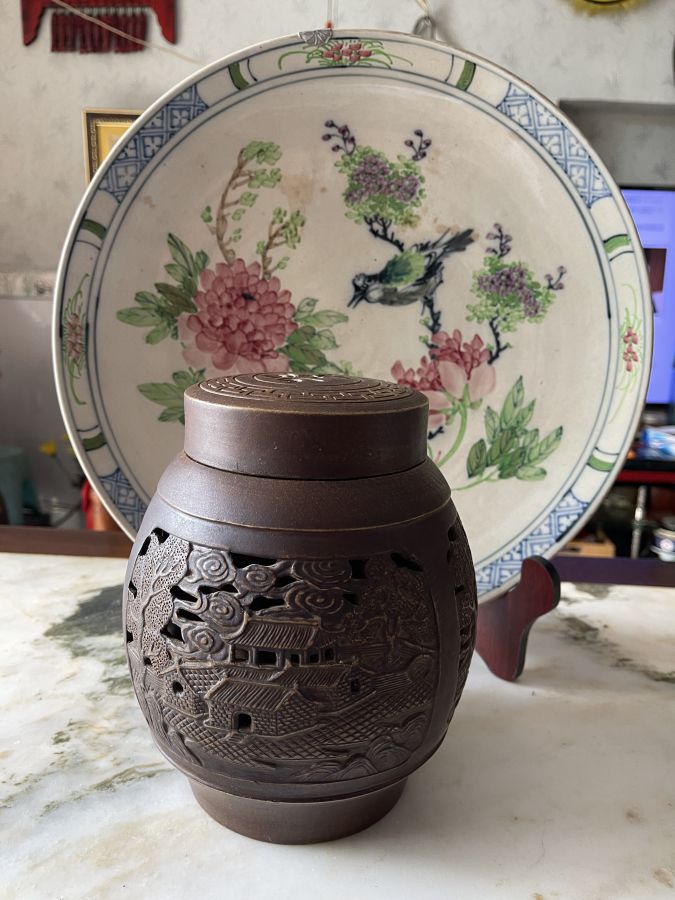 Hủ trà tử sa 2 lớp khắc tay thủ công .