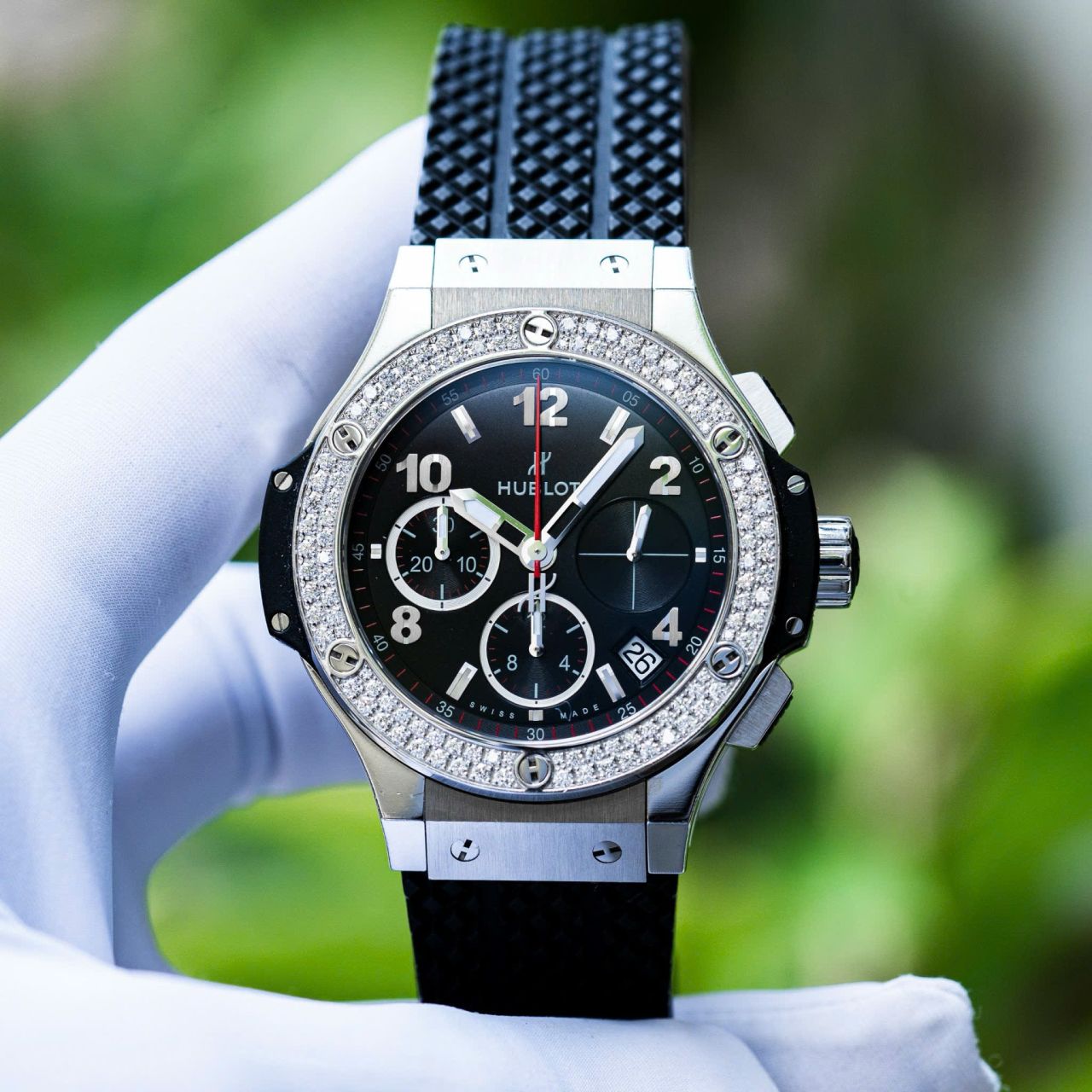 -Vỏ đồng hồ bằng thép không gỉ, niềng kim cương zin hãng, trung tâm là bộ kim skeleton phủ dạ quang.